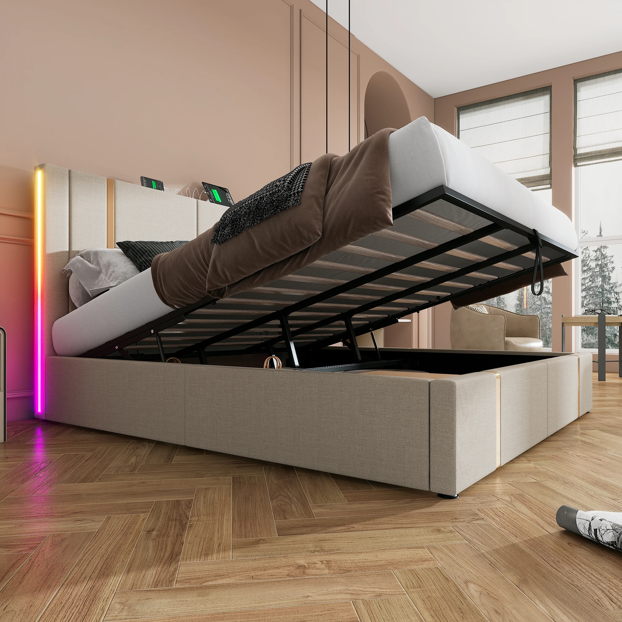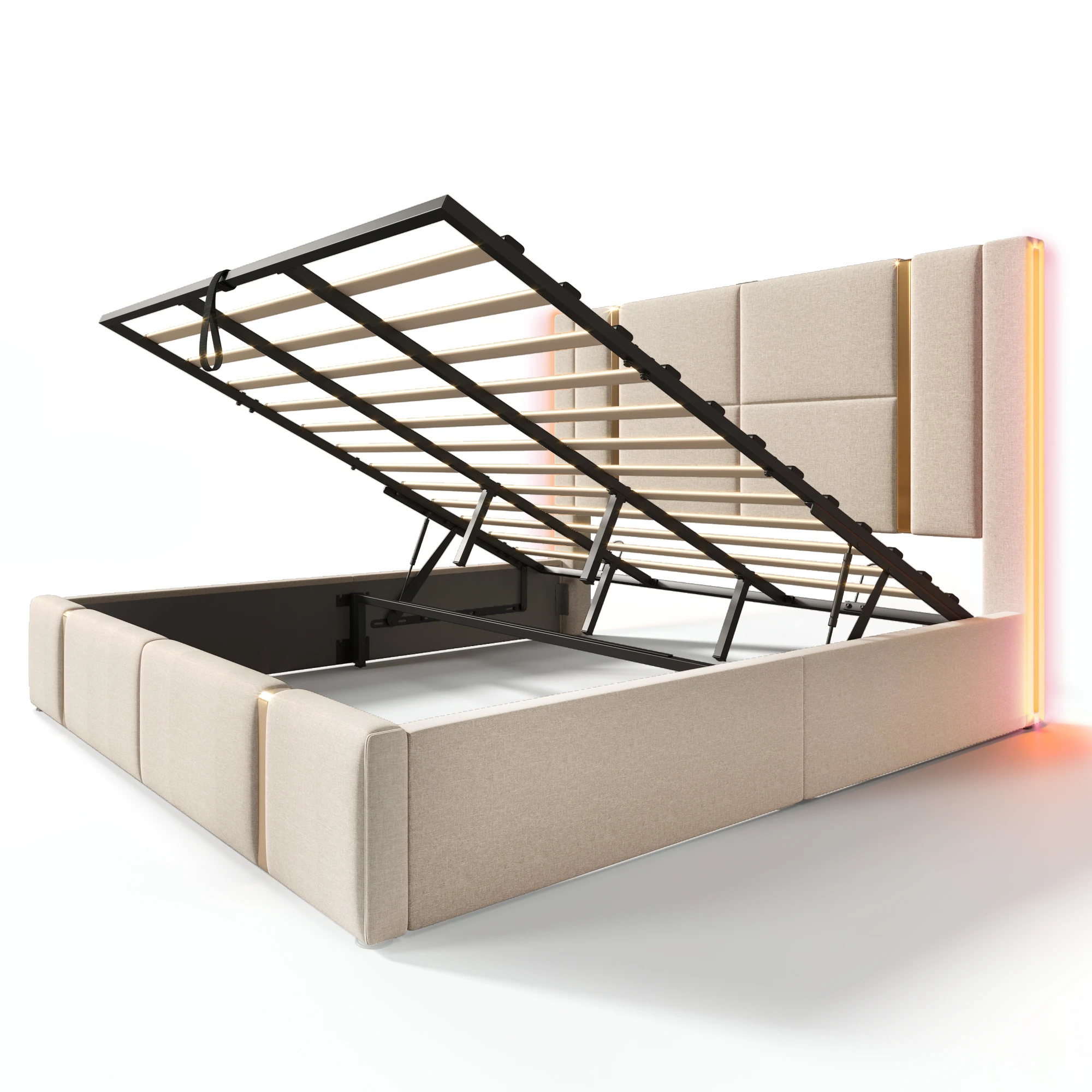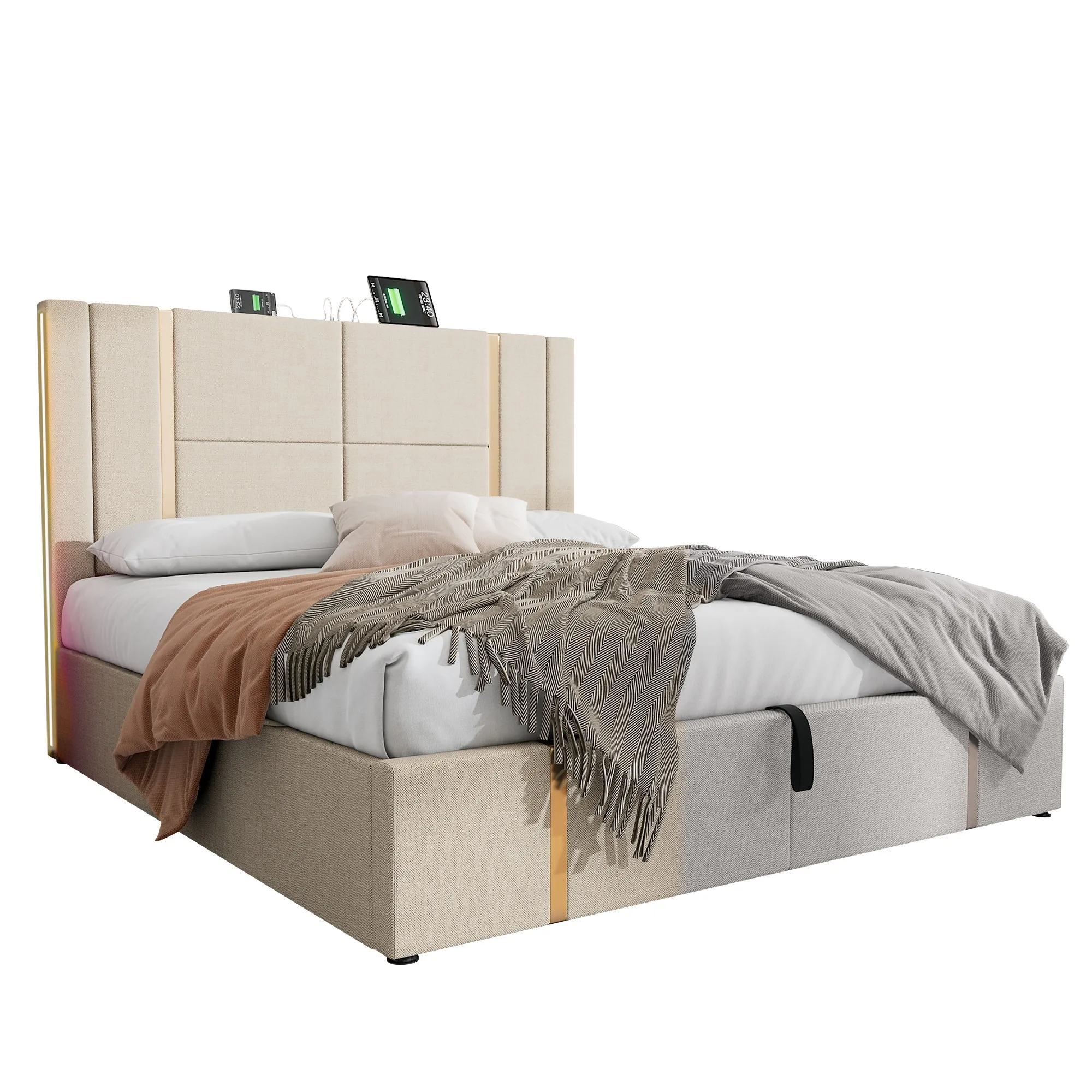 Двуспальная кровать с мягкой обивкой, 180х200 см, кровать для хранения вещей, каркас кровати, основание с деревянными решетками, бежевый льняной материал (матрас в комплект не входит)