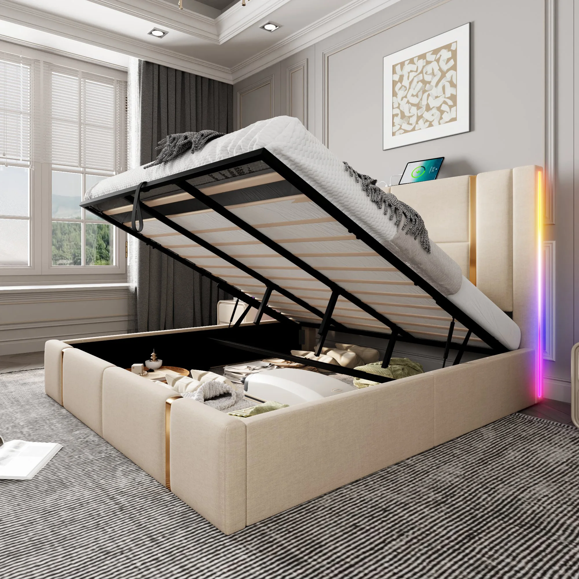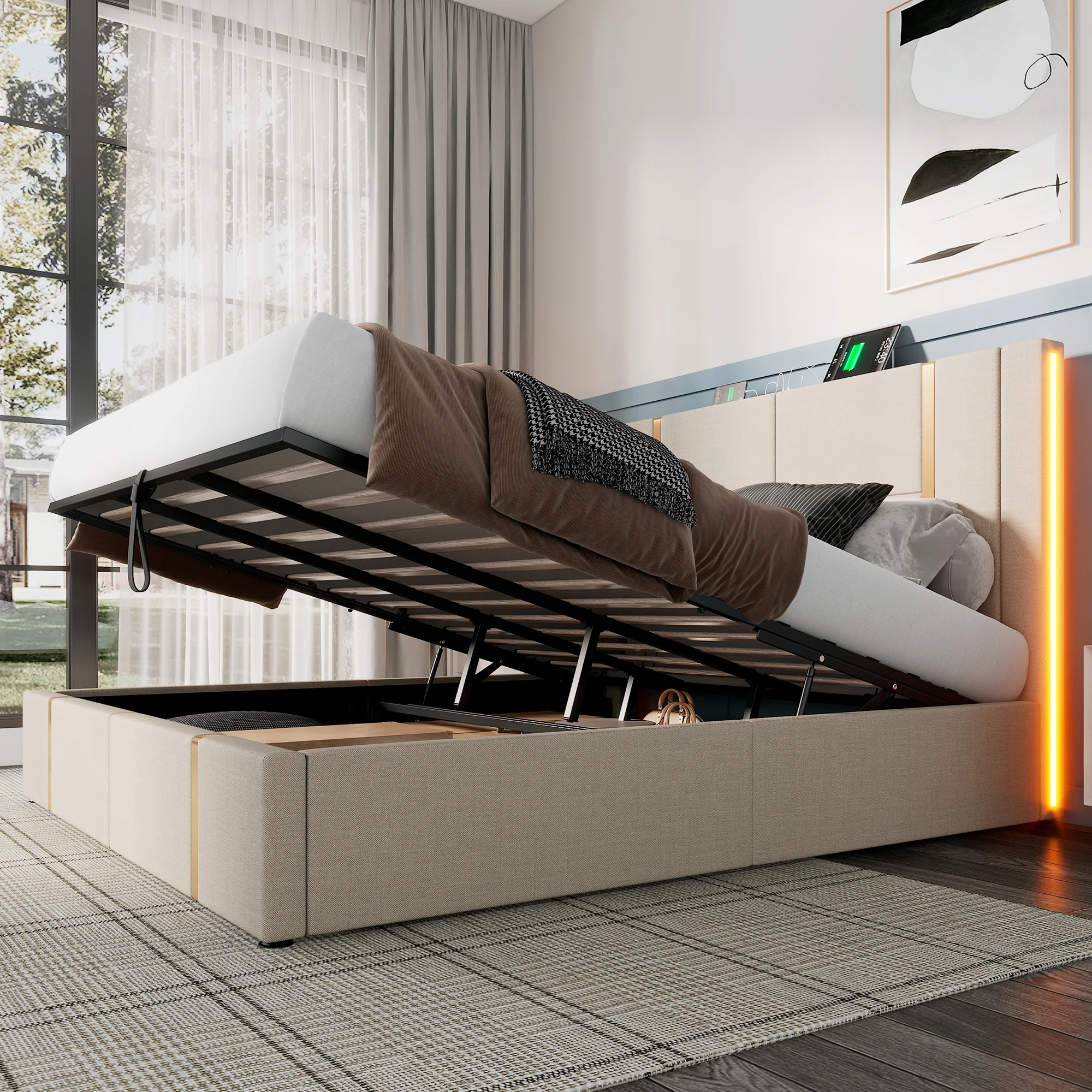 4.Место для хранения под кроватью: подъемная кровать с местом для хранения имеет уникальную высококачественную конструкцию гидравлической газовой пружины, которая обеспечивает достаточно места для хранения под кроватью, которую легко поднять, опускать или закрыть.Это отличный выбор для хранения чемоданов, ящиков для хранения, послесезонного постельного белья и одежды, а также редко используемых предметов.Создайте больше места в своей спальне для занятий спортом и поддерживайте порядок в комнате.