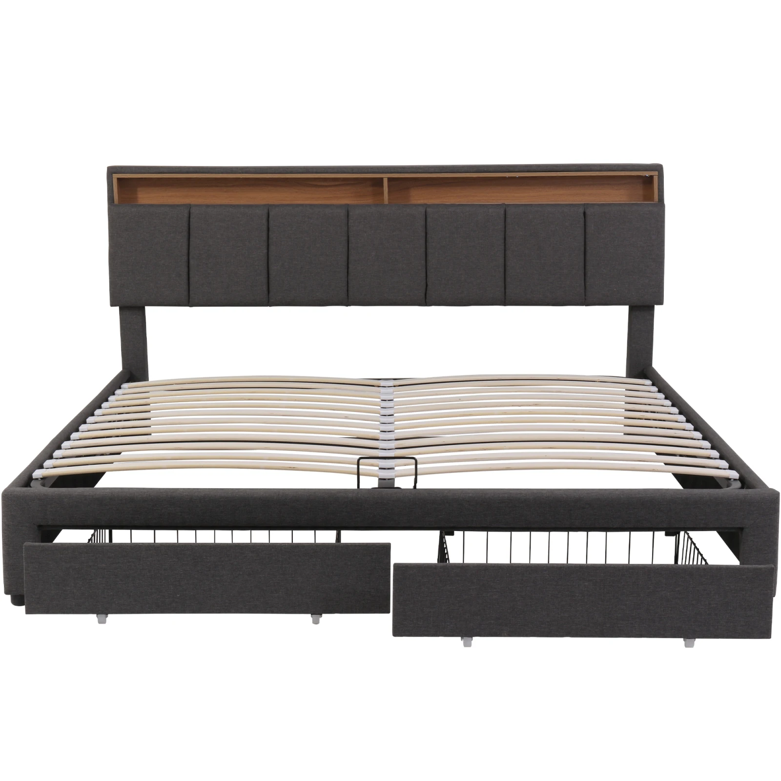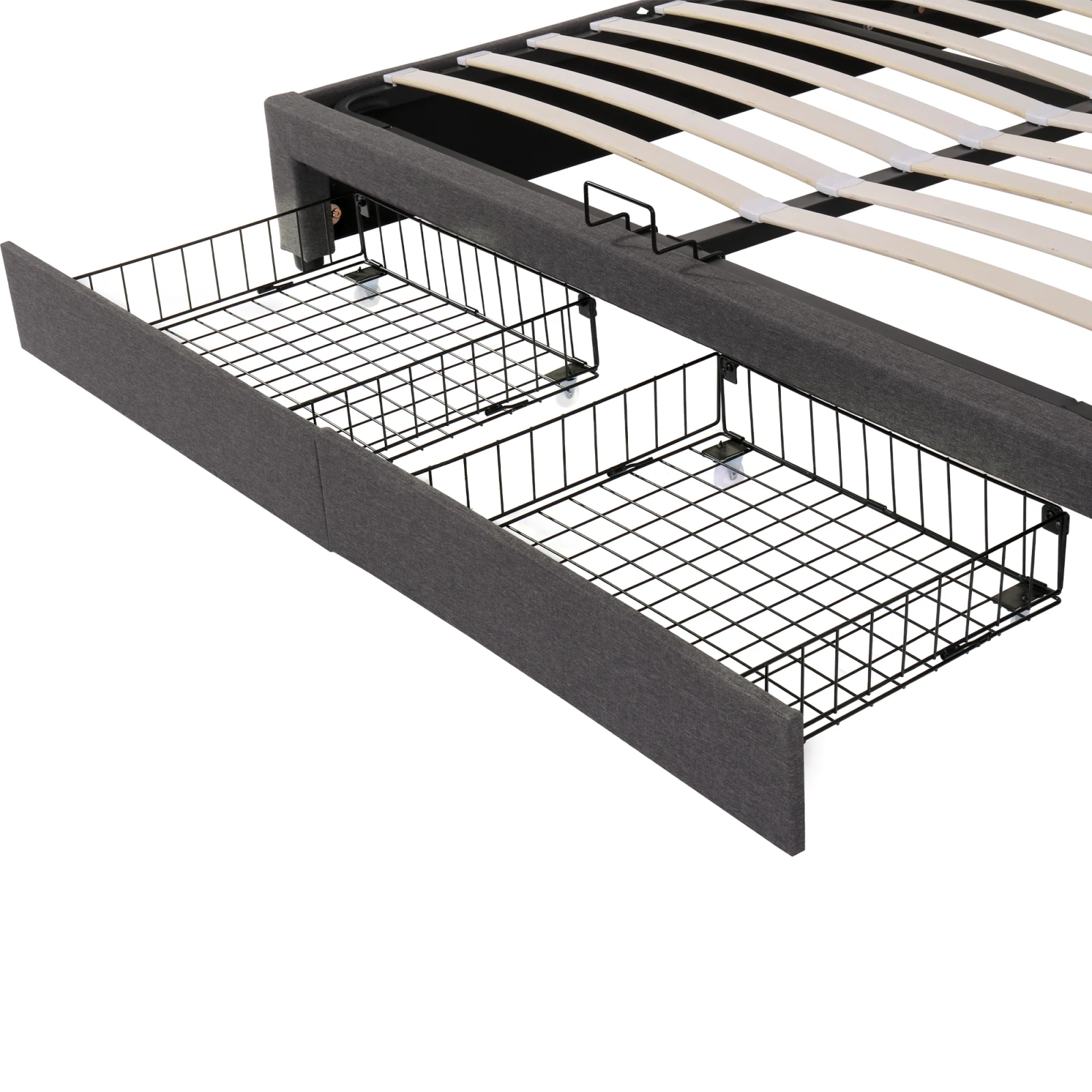 Двуспальная кровать с подкладкой, каркас кровати с изголовьем ящика и 2 ящиками, двуспальная кровать со светодиодной подсветкой, кровать для взрослых и подростков, кровать серого цвета