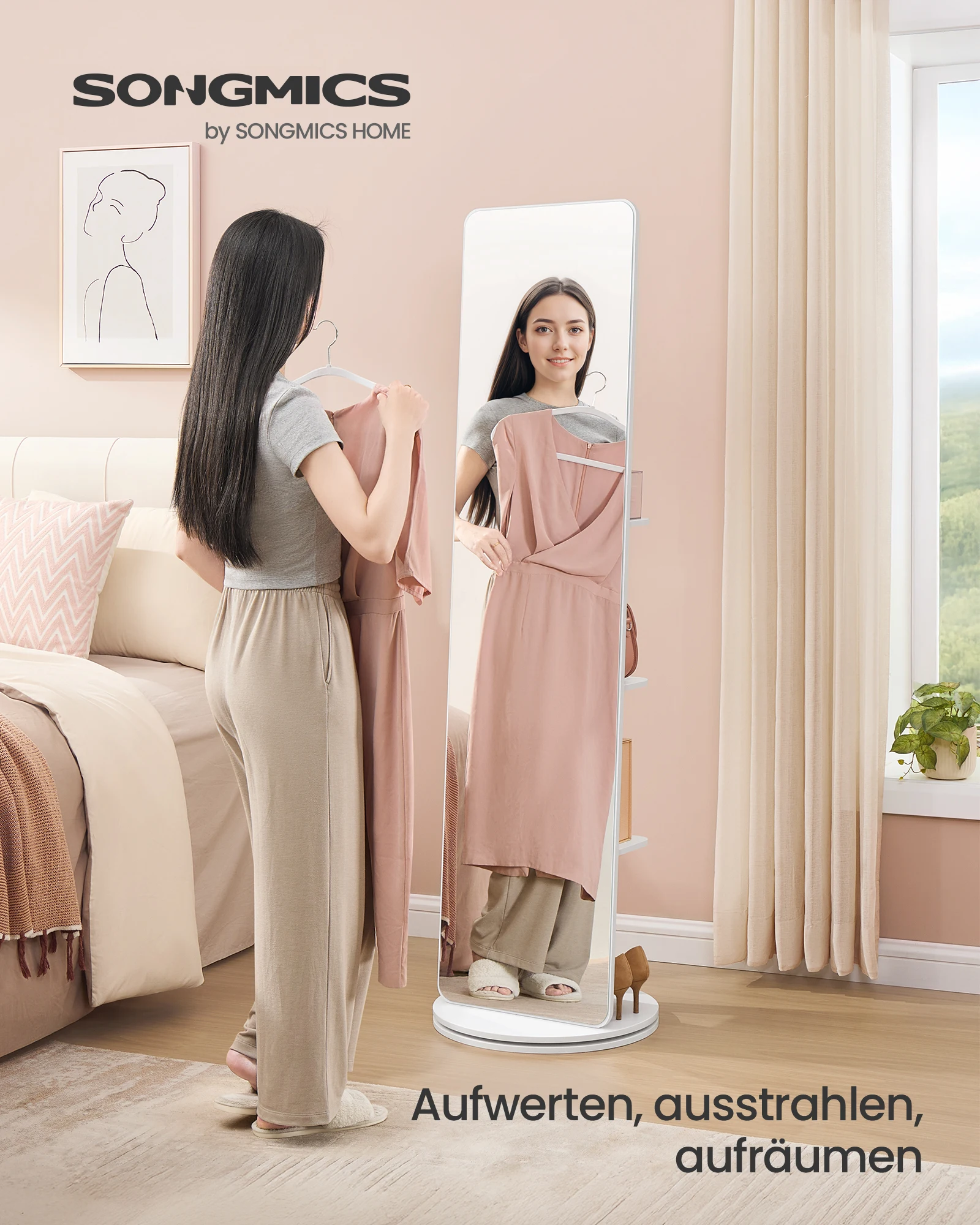 Дзеркало SONGMICS в полный рост, стоящее зеркало 360° ° Вращающееся зеркало 163х45 см с базовыми полками и крючками из прозрачного закаленного стекла.