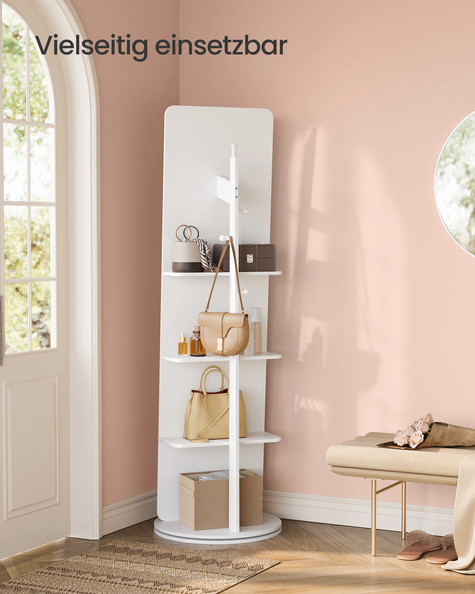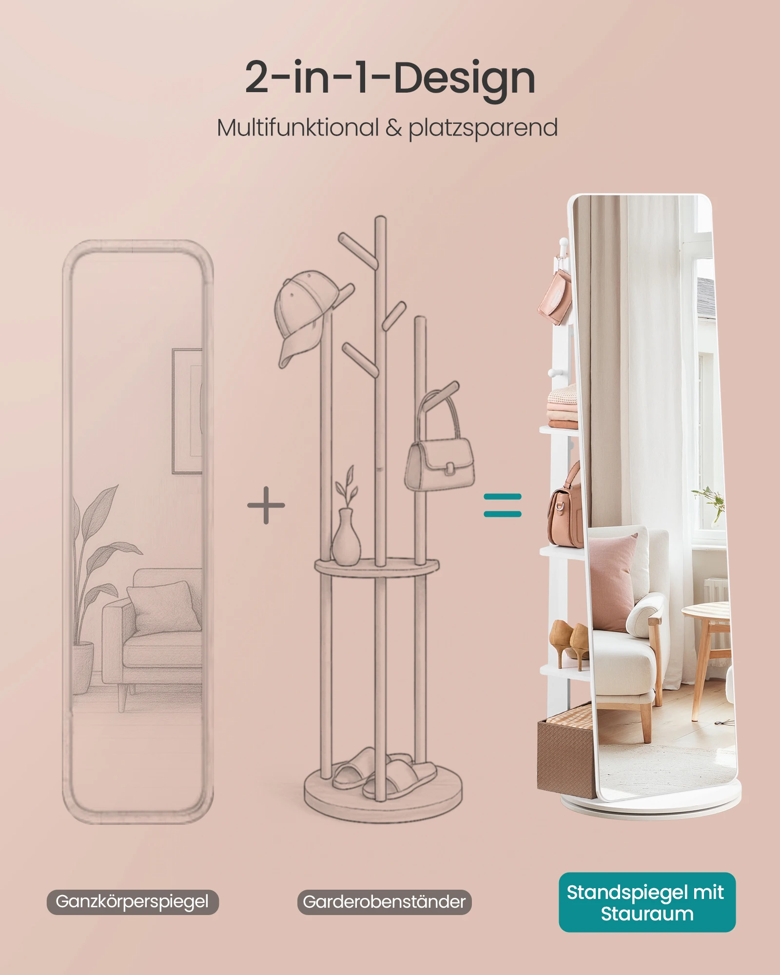 Многофункциональность:Зеркало во всю длину облегчает ежедневную проверку наряда; 4 полки и 4 крючка для дополнительного места для хранения, а также 360°.° вращающаяся конструкция для удобного доступа