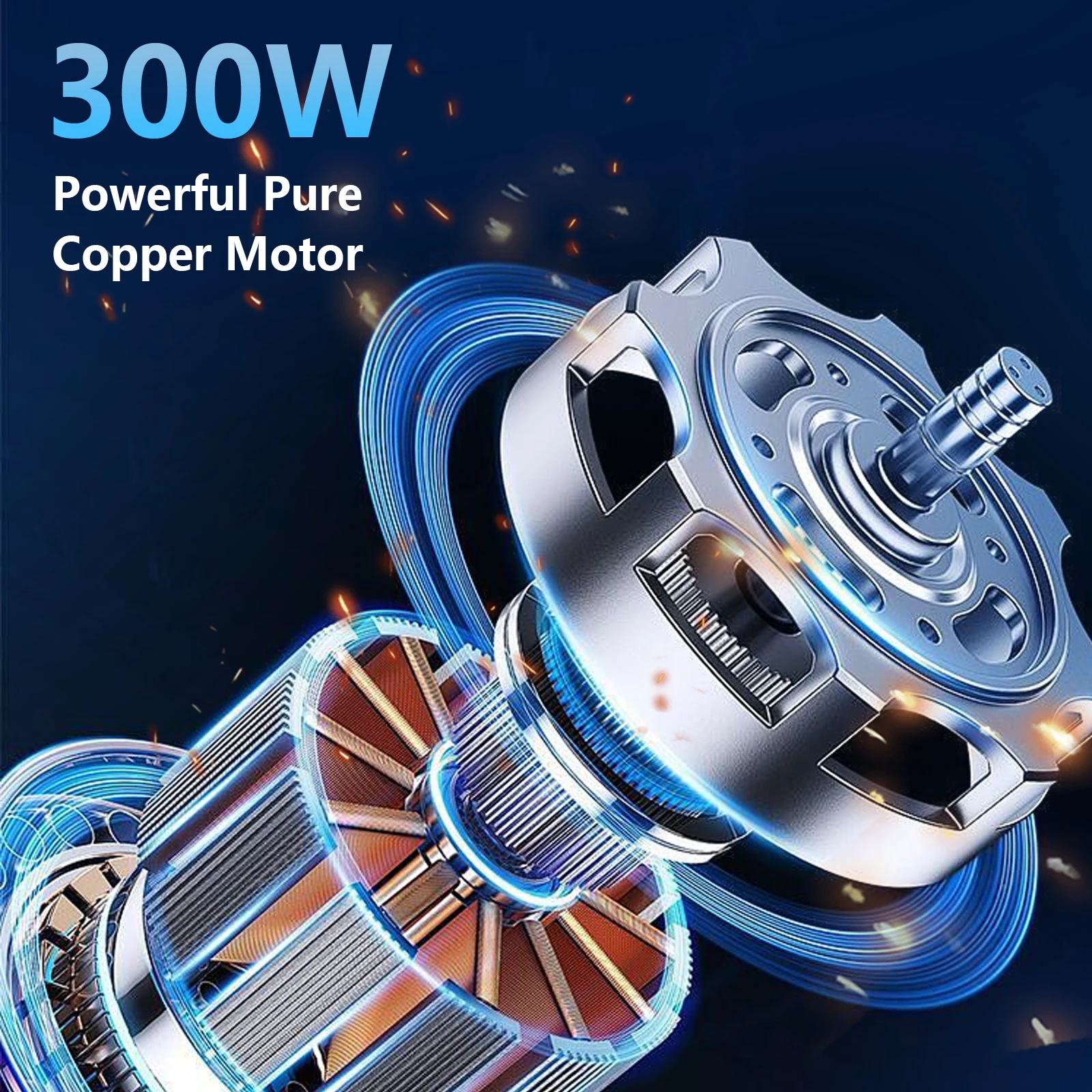 Оснащен мощным двигателем из чистой меди мощностью 300 Вт, обеспечивающим длительную мощность.