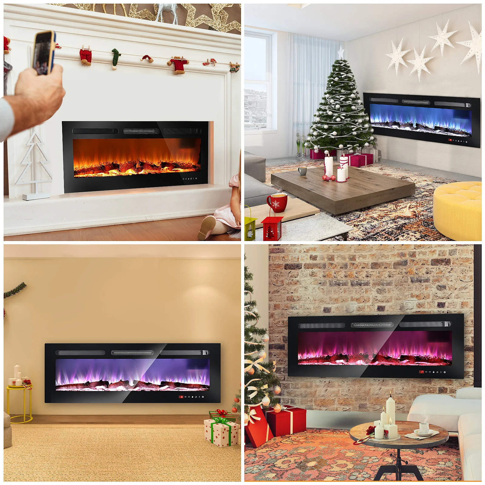 Электрический камин 107 см, 127 см, настенный, встраиваемый и настенный, с регулируемым пламенным цветом, таймером, сенсорным экраном, бревнами и кристаллами