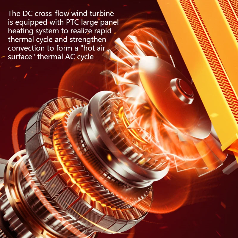 Ветряная турбина постоянного тока с перекрестным потоком оснащена системой нагрева с большими панелями PTC для реализации быстрого теплового цикла и усиления конвекции для формирования теплового цикла переменного тока «поверхности горячего воздуха».