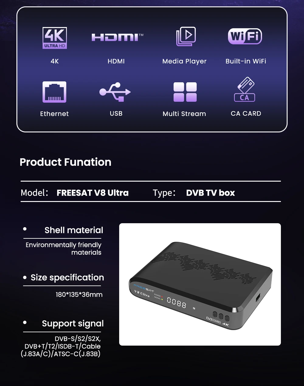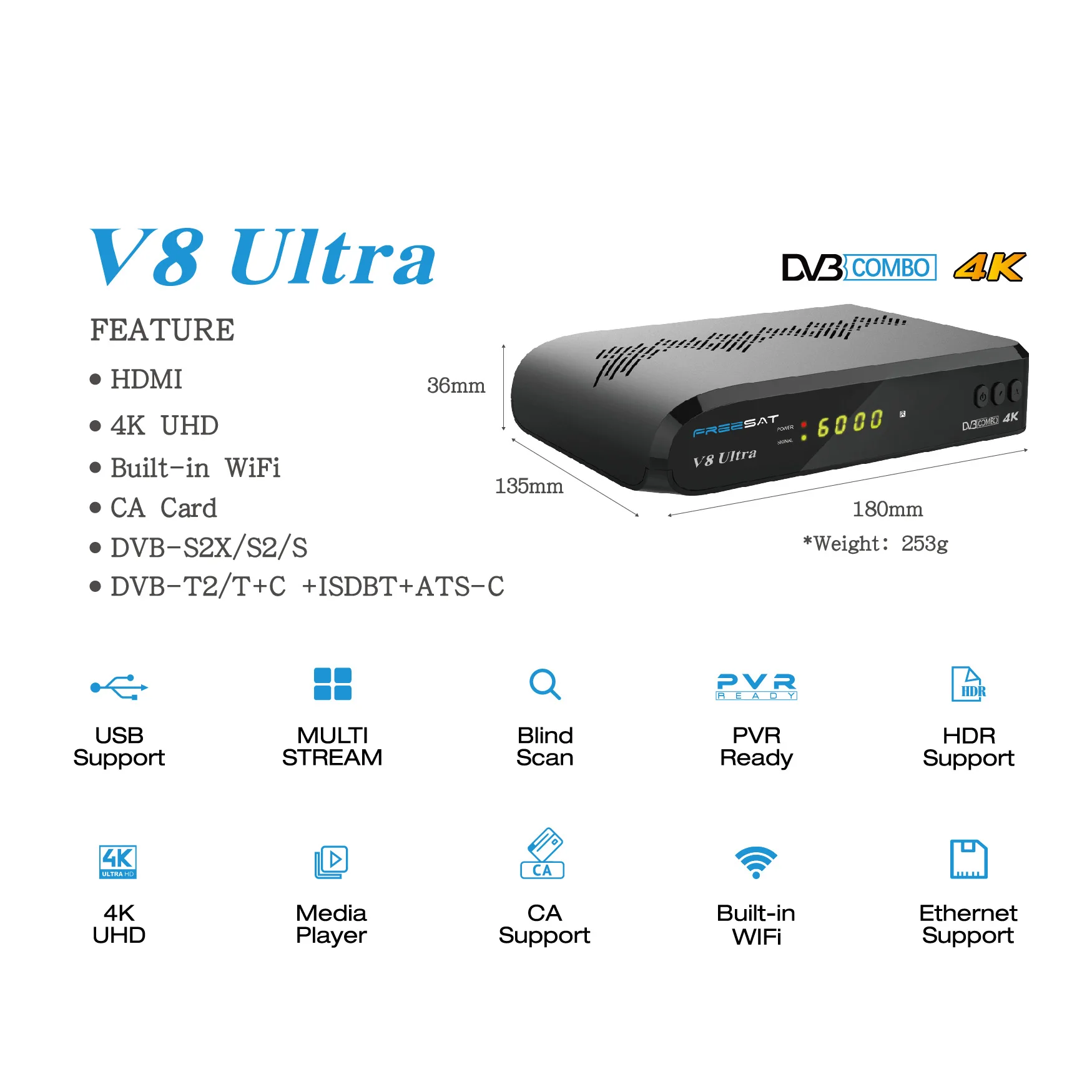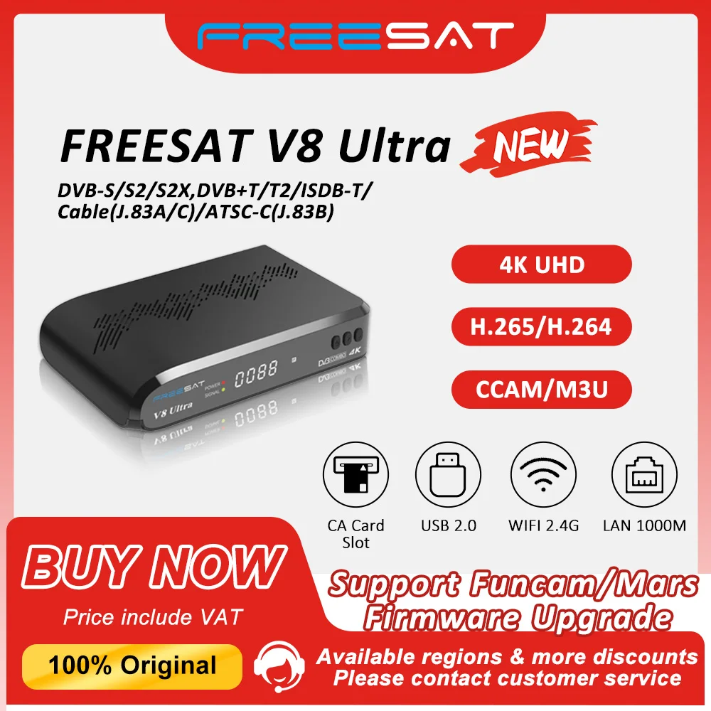 FREESAT V8 Ultra 4K UHD спутниковый ресивер DVB-S2X/S2/S/T2/T/C H.265 2,4G Wi-Fi 1000M LAN CA Слот для автомобилей MARS FUNCAM M3U ТВ-декодер