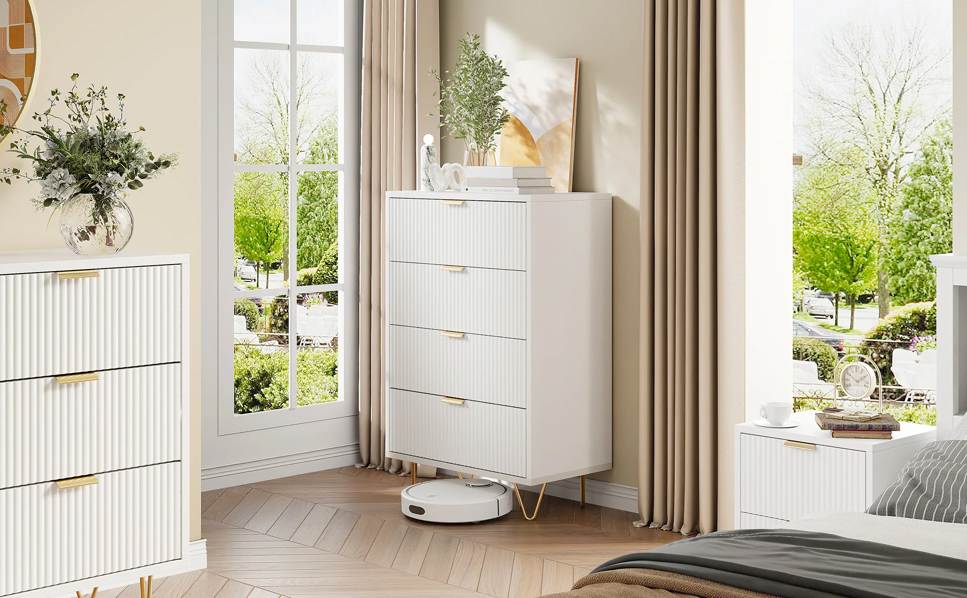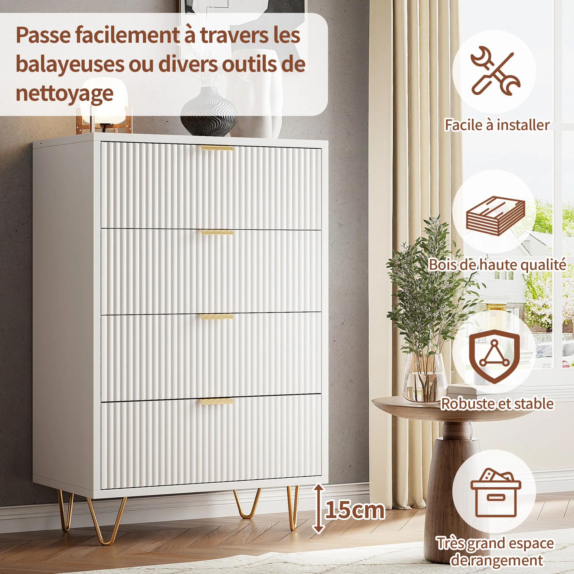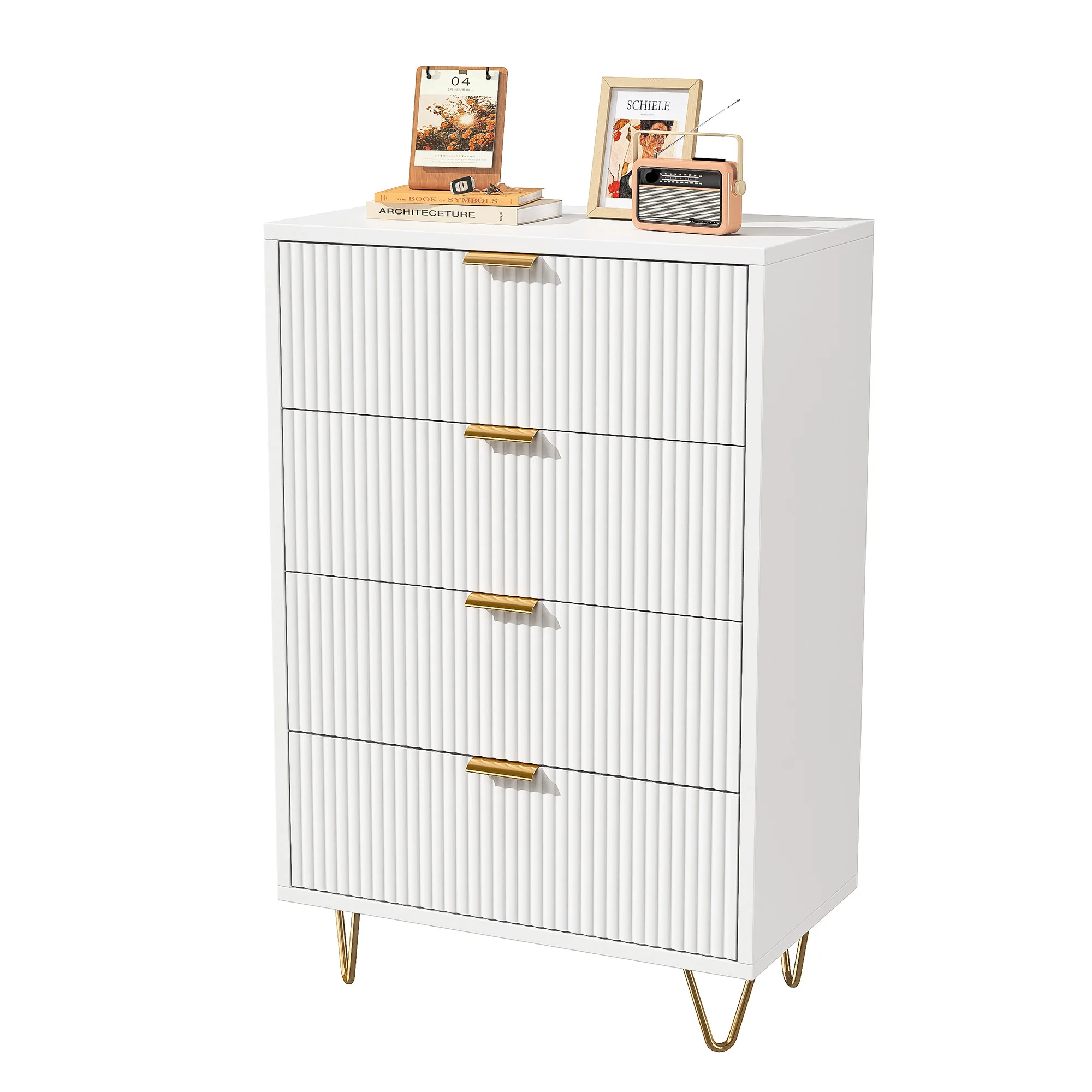Уникальный и современный дизайн: этот белый удобный дизайн с 4 ящиками имеет ребристый ребристый фасад плюс красивый эффект, создающий элегантный вид и уникальный визуальный эффект.Широкие металлические ручки и расклешенные опоры дополняют современный дизайн, что делает эту удобную стильную мебель для любой комнаты, будь то спальня, гостиная или прихожая.