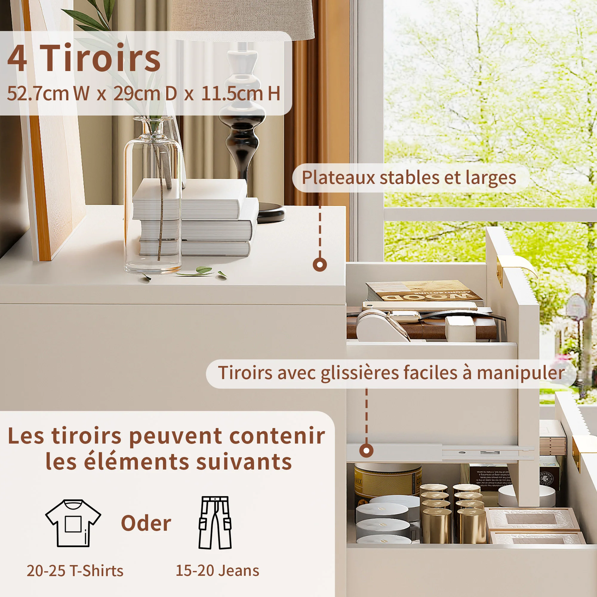 Идеальные размеры: ширина 60 см, глубина 34 см и верхняя часть 91, эта удобная конструкция имеет четыре просторных плавных ящика.Эффективно храните свою одежду, аксессуары и другие личные вещи.Идеально подходит для небольших и средних помещений, предлагает функциональную организацию.