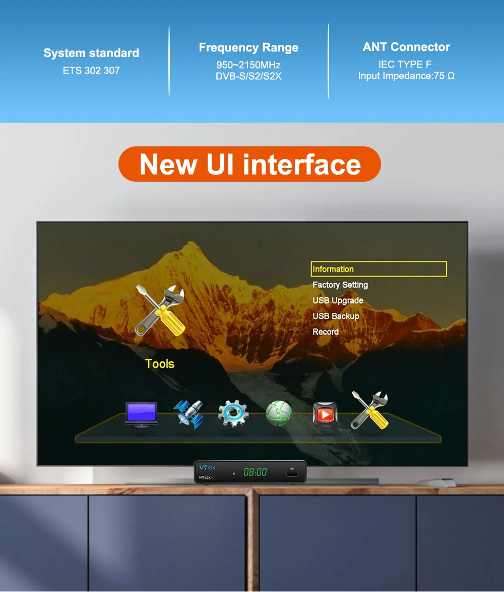 3. Поддержка Unicable, DiSEqC1.0/1.1/1.2/USALS Двигатель полностью поддерживает;
