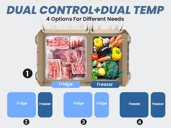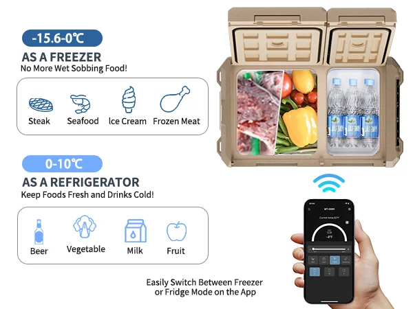 Этот портативный автомобильный холодильник объемом 35/45 л имеет два независимых отделения с отдельным контролем температуры (можно установить как холодильник/морозильную камеру, морозильную камеру/морозильную камеру).Каждая зона работает независимо, что позволяет хранить разные предметы при идеальных температурах.