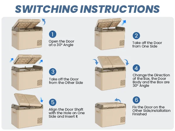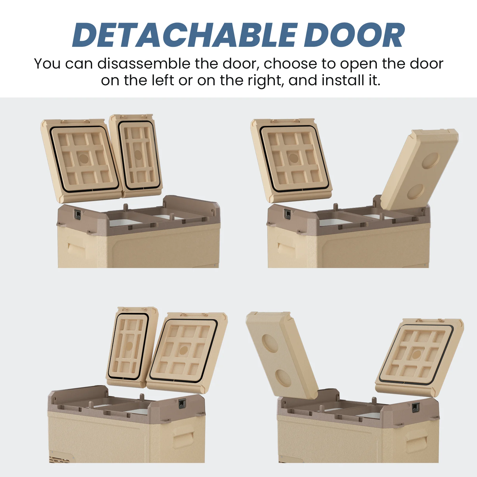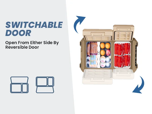 Дверцу холодильника можно отсоединить и переместить, что облегчает доступ к еде и напиткам во время вождения или в кемпинге.