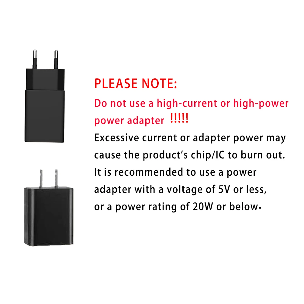Обратите внимание: не используйте сильноточный или мощный адаптер питания.Чрезмерный ток или мощность адаптера могут привести к перегоранию чипа/IC продукта.Рекомендуется использовать адаптер питания с напряжением 5 В или меньше, номинальной мощностью 20 Вт или ниже.
