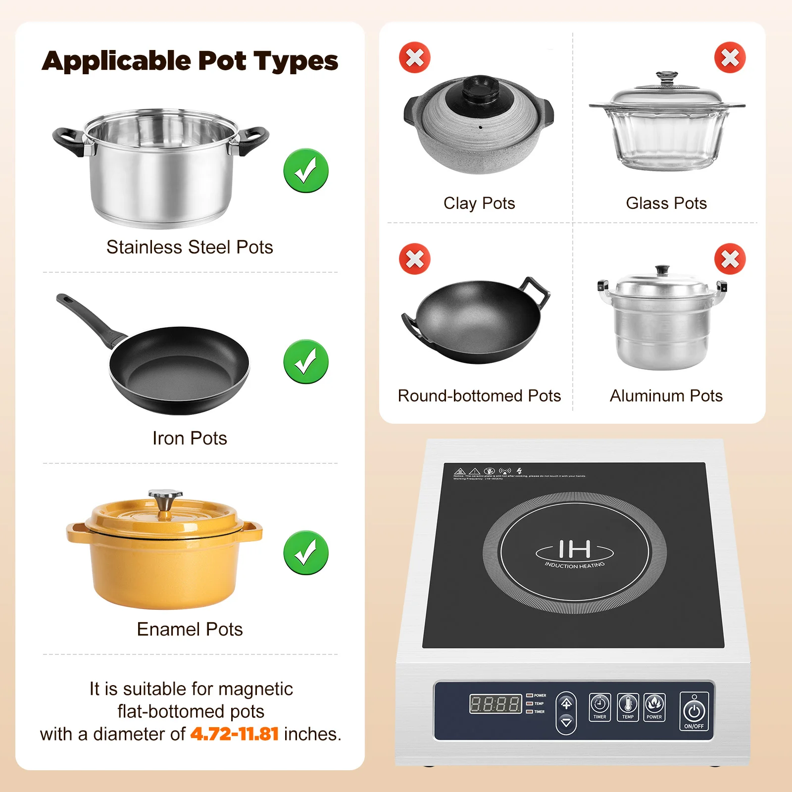 Он подходит для сковородок с плоским железным дном диаметром 4,72-11,81 дюйма и может использоваться на домашних кухнях, приготовлении пищи на заднем дворе, автофургонах, гостиницах, ресторанах, столовых и т. д.