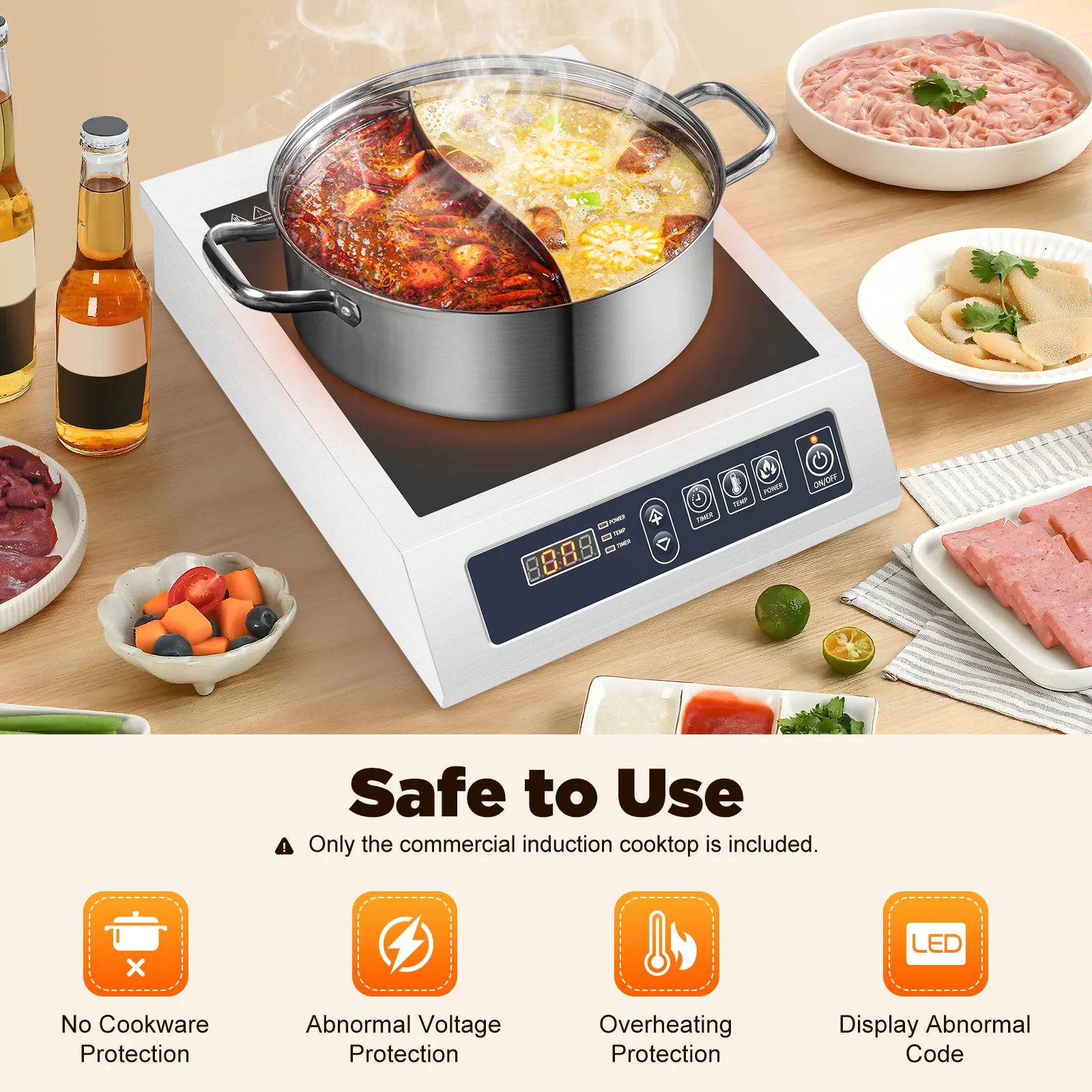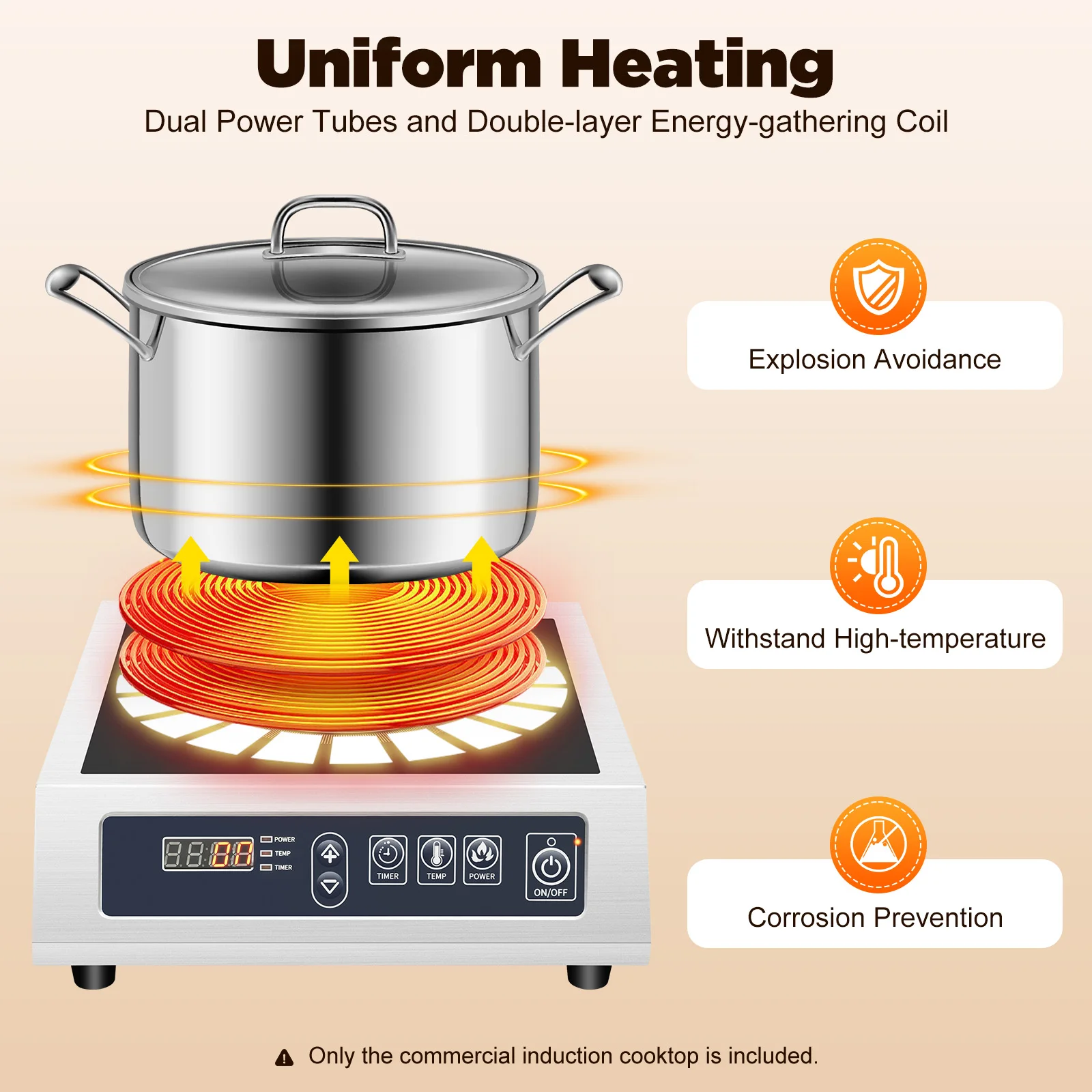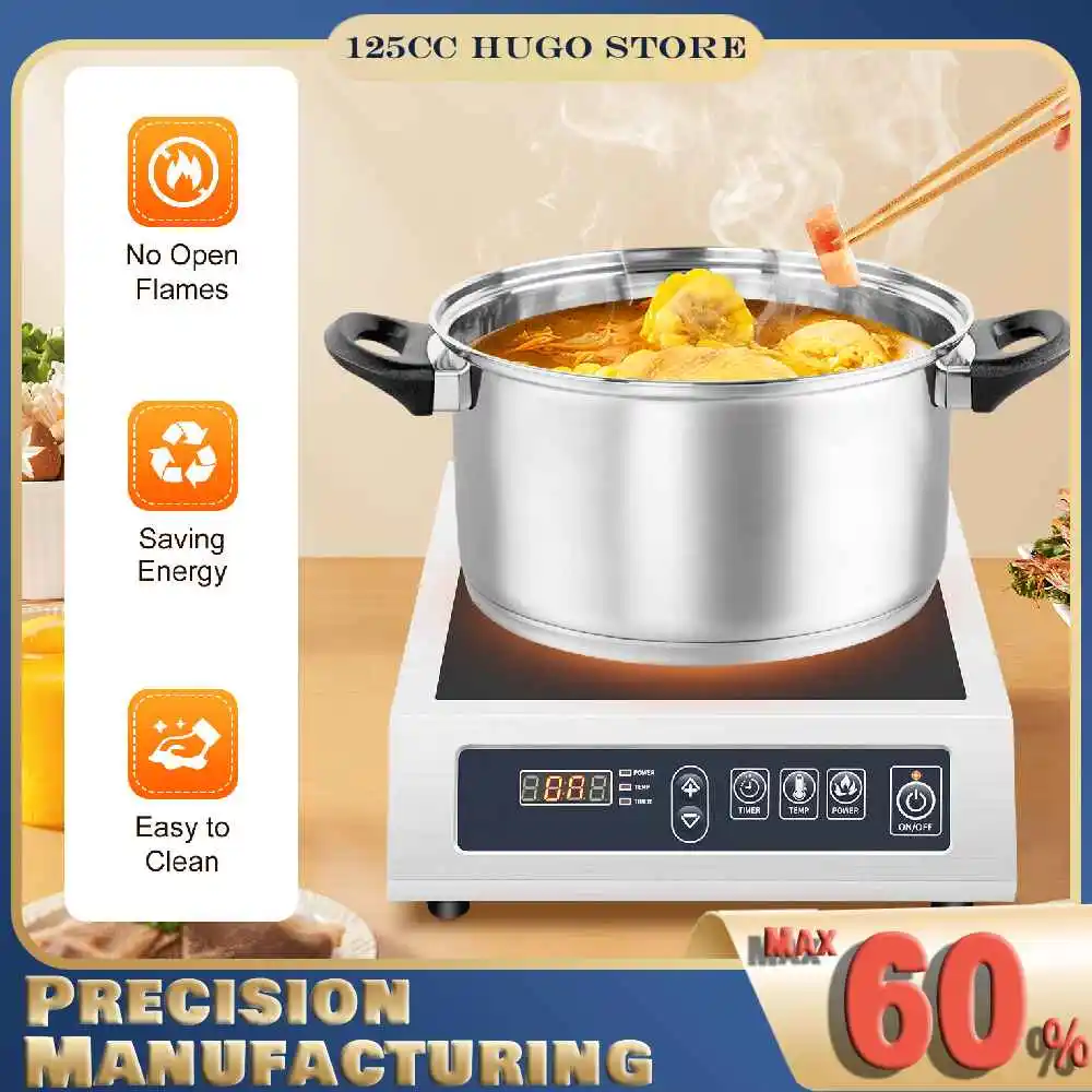 Быстрый нагрев: высокая мощность (3500 Вт), катушка из чистой меди и увеличенная площадь нагрева (диаметр 9,06 дюйма) обеспечивают быстрый и равномерный нагрев, удовлетворяя ваши коммерческие потребности в приготовлении пищи и экономя много времени на приготовление.