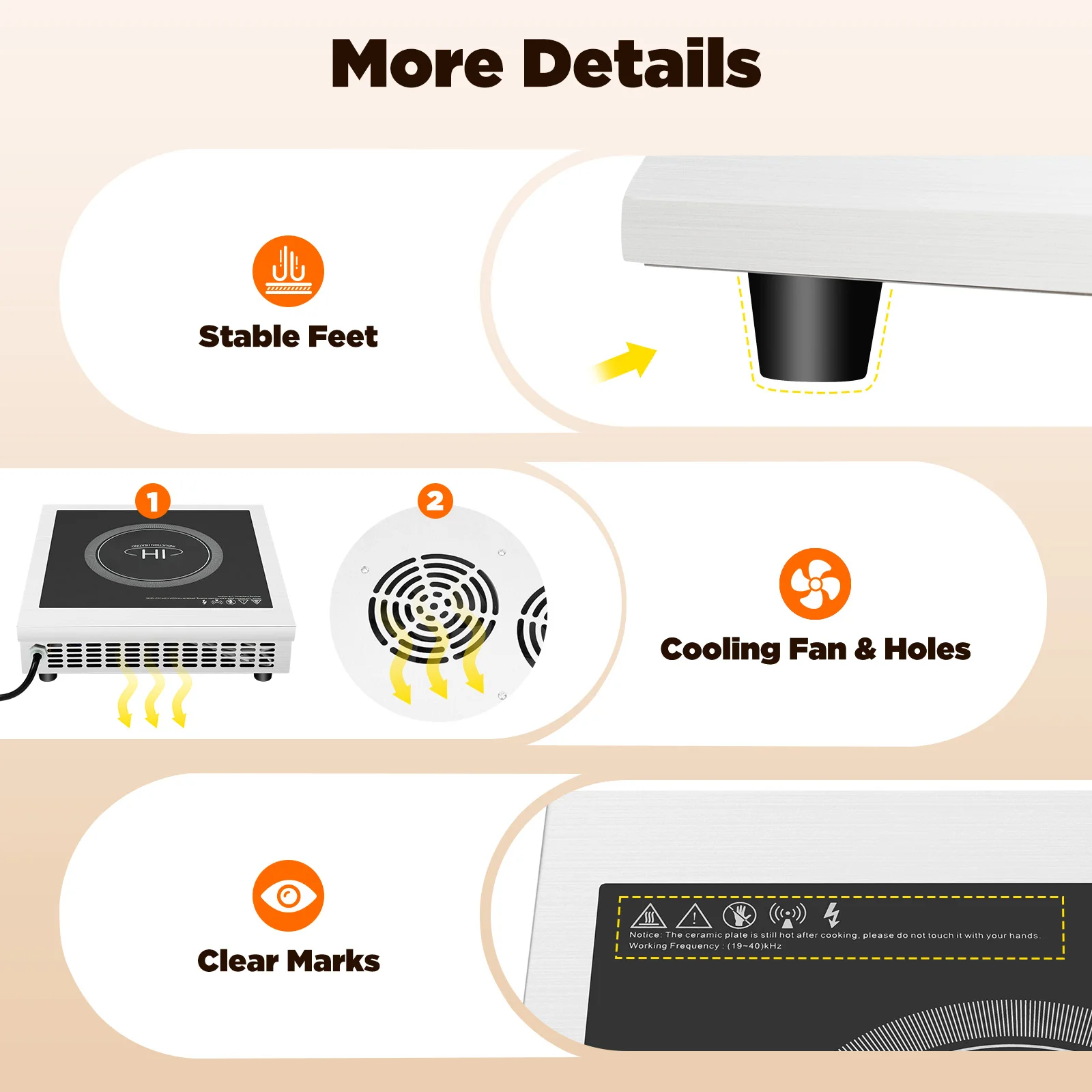 Высокая безопасность: он не имеет открытого огня и имеет защиту от сухого горения, отключение при сбое в цепи, блокировку рассеивания тепла, защиту от перегрева и функцию отключения без кастрюль, что позволяет вам иметь более безопасную среду приготовления и обеспечить вашу безопасность.