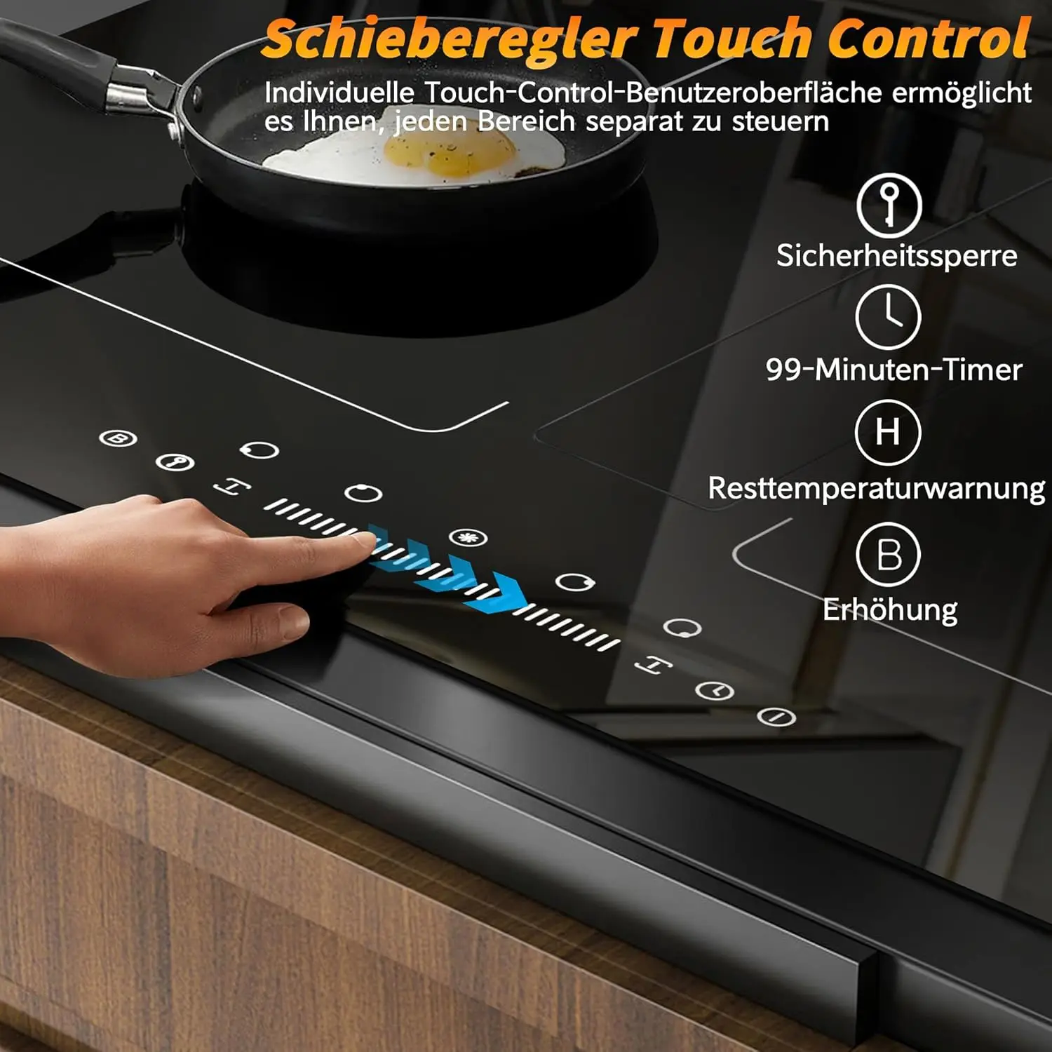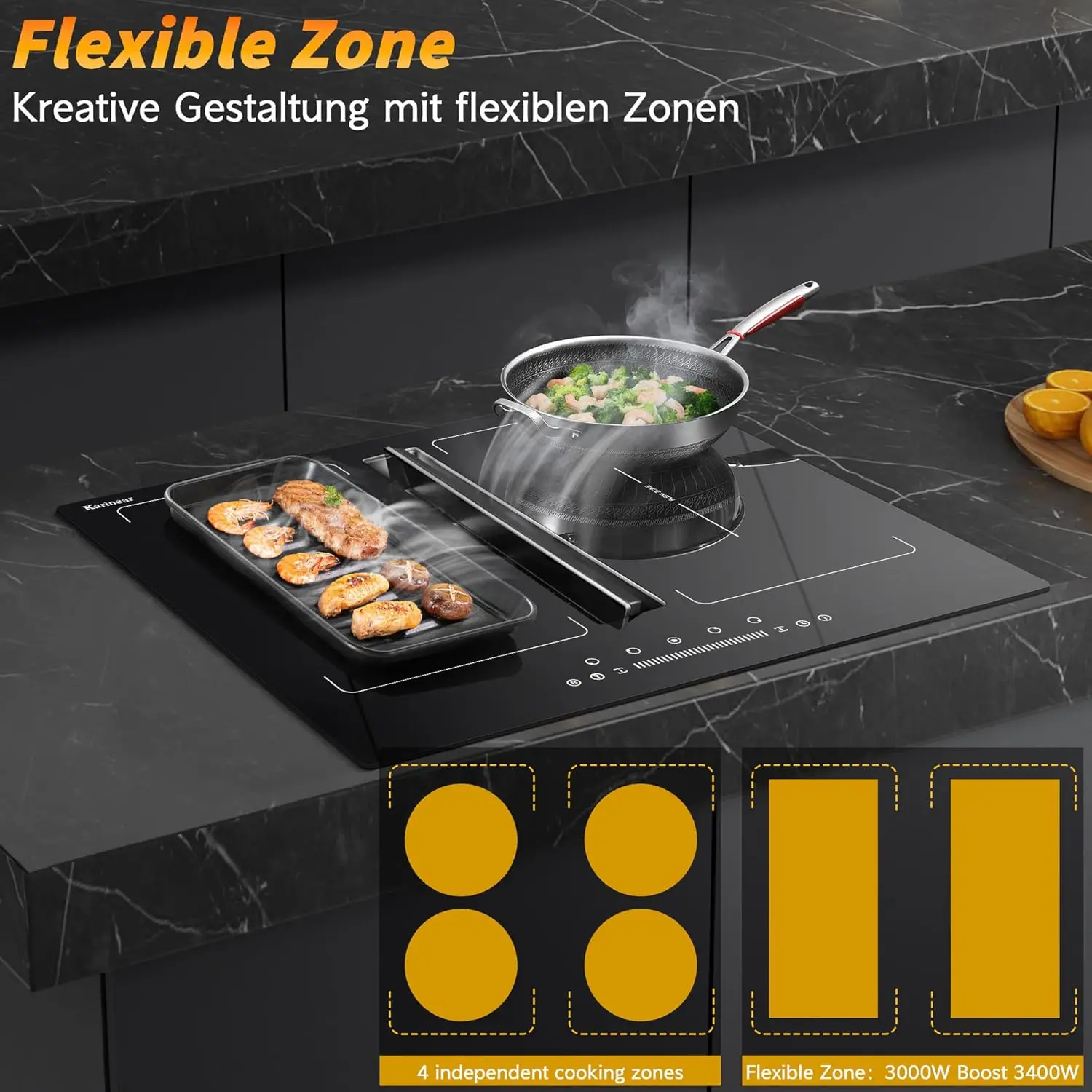 Индукционная варочная панель Karinear, 4 зоны, гибкая зона с экстрактором (155 Вт), встроенная вытяжка 60 см, таймер, усиление, пауза, 7200 Вт, без вилки