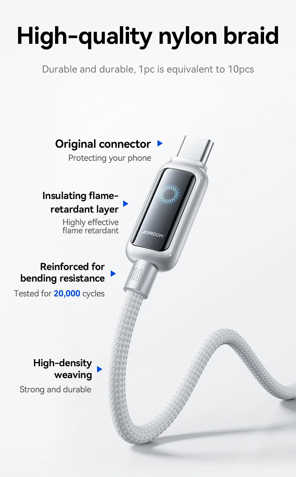 Протестировано на выдержание более 10 000 изгибов благодаря нейлоновой оплетке премиум-класса и усиленным точкам напряжения.