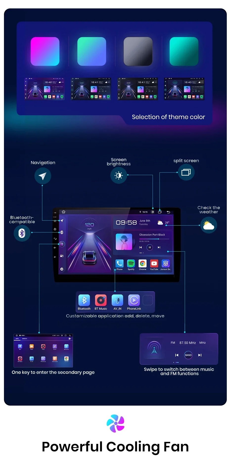 【Powerful Cooling Fan】The radio is equipped with a more powerful and larger cooling fan to avoid reboot or abnormal touch or abnormal function caused by overheating or long-term use. With it, many applications can work smooth at the same time