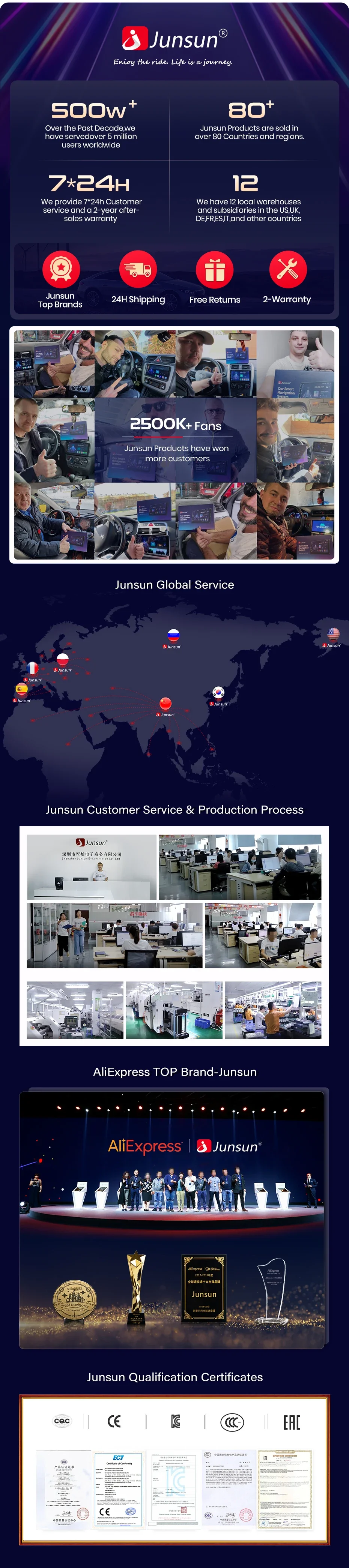 1. As the official Junsun store on AliExpress, we’re committed to delivering authentic, original products. Celebrated as one of AliExpress’s Top 10 Brands, Junsun has earned the trust of over 2 million fans and has served more than 5 million users globally for over a decade. Choose Junsun for dependable, cutting-edge car equipment that enhances your driving experience with both safety and intelligence.