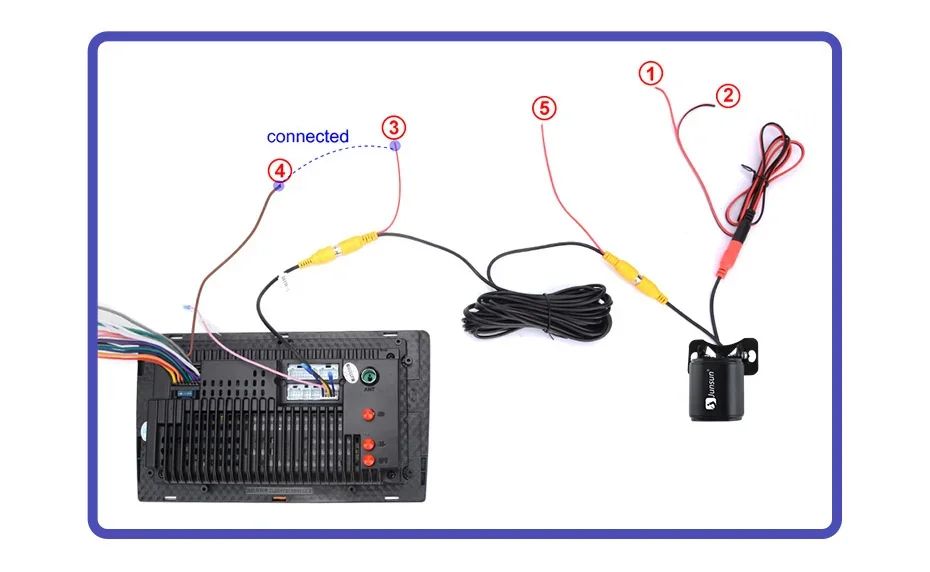 3)The reversing detection cable ④(Brown color) is connected to the red cable ③ which extending from the video input cable, please follow the picture below to connect.