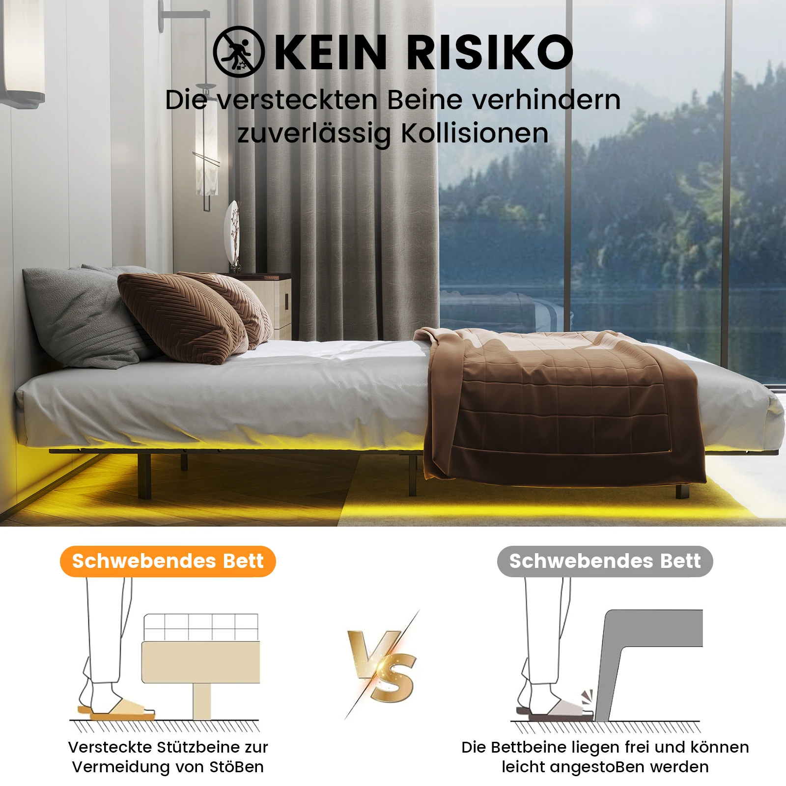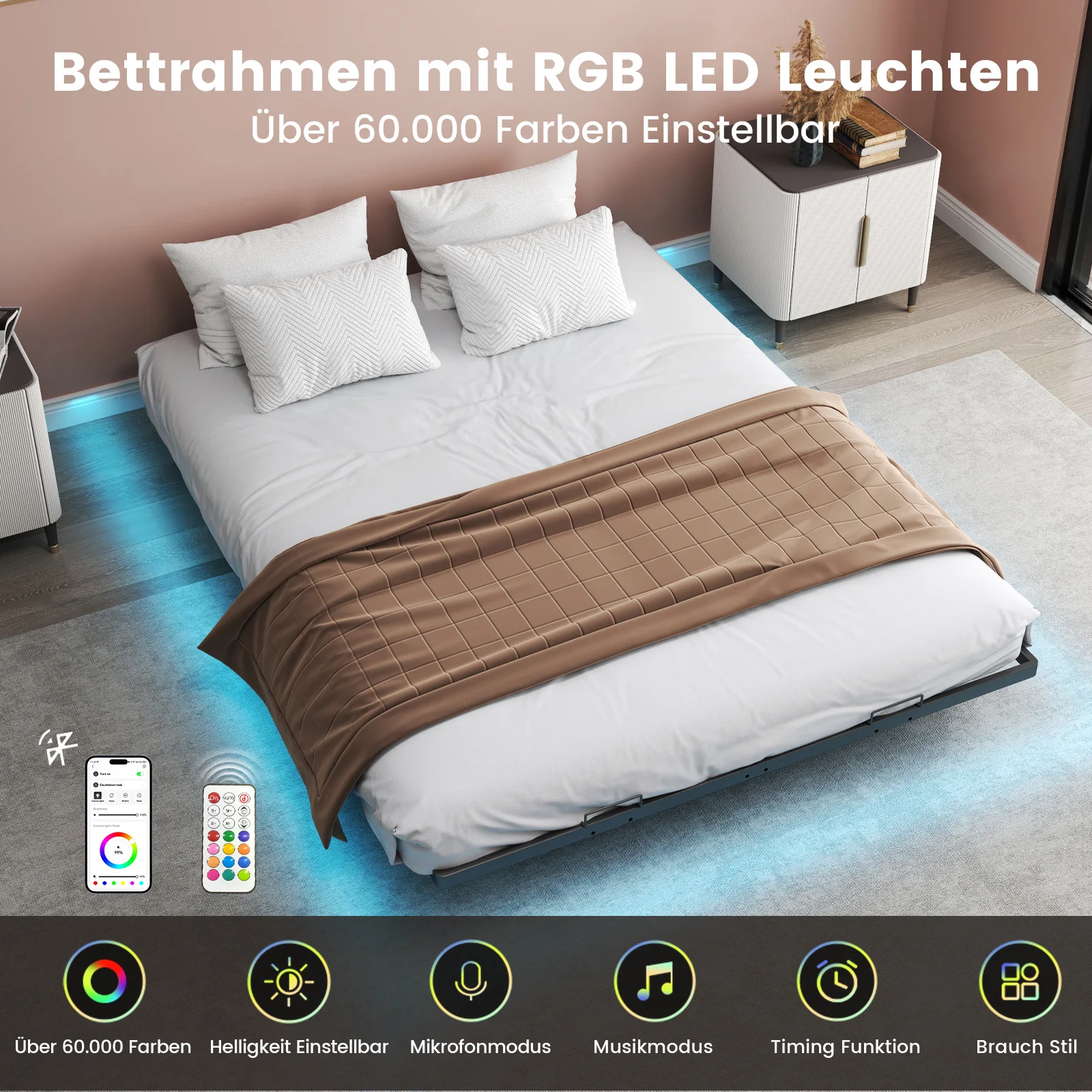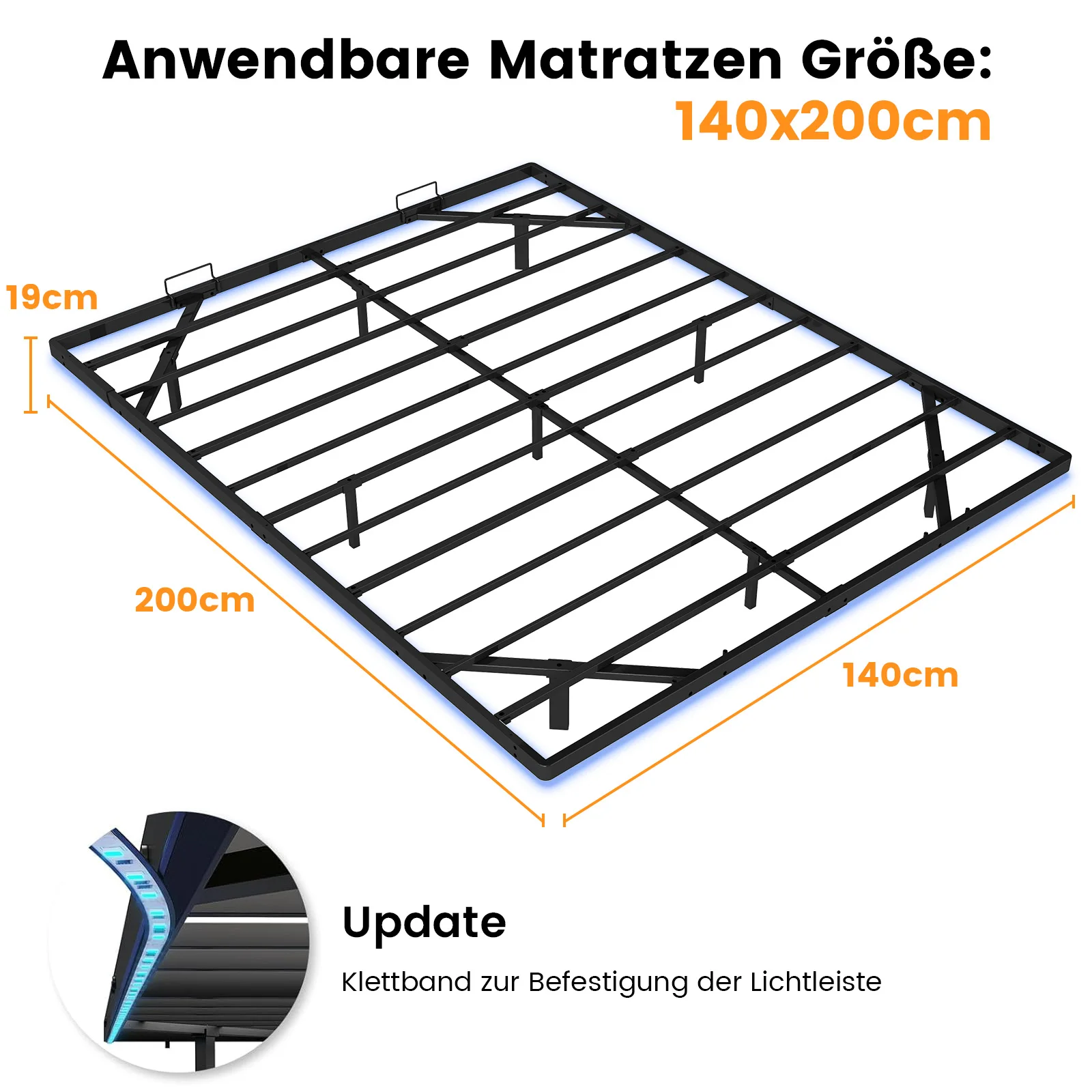 Каркас кровати COMHOMA Кровать металлическая Кровать для гостей Кровать Rher со светодиодом и розетками Молодежная кровать 140×200, Приложение и пульт дистанционного управления
