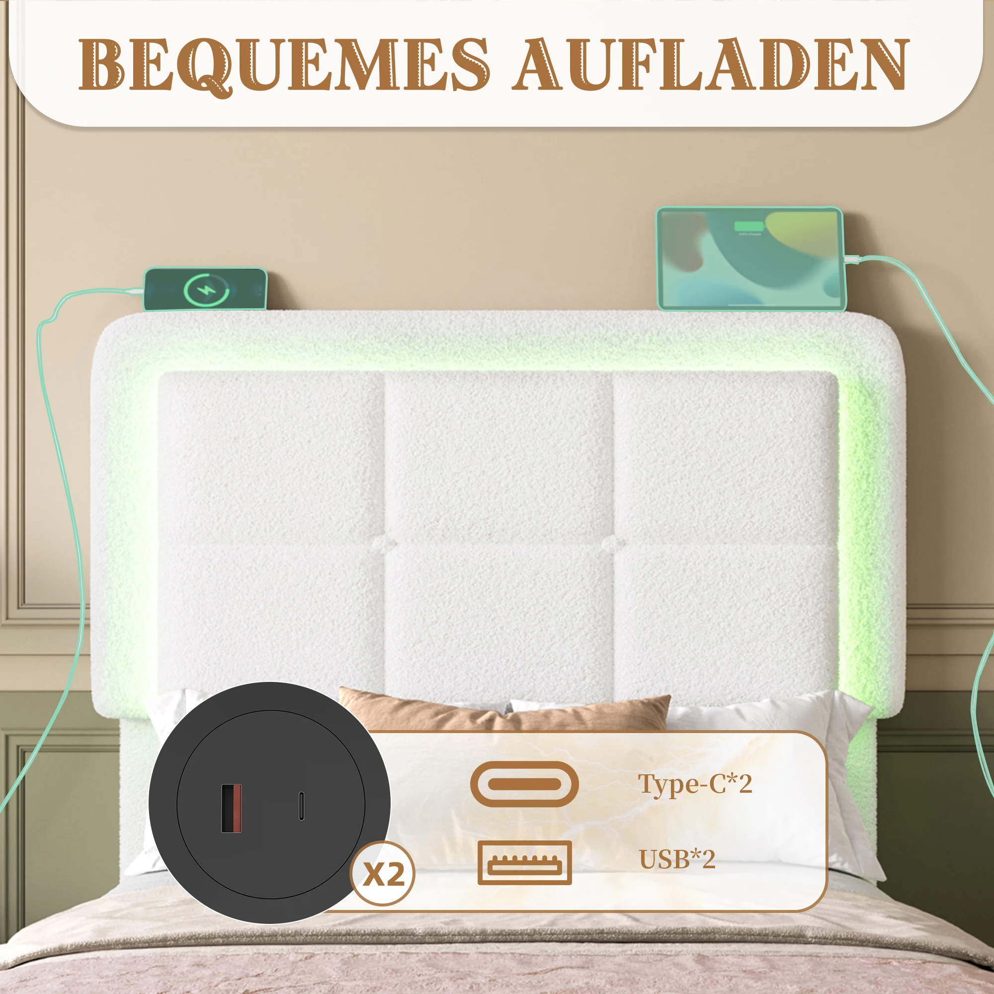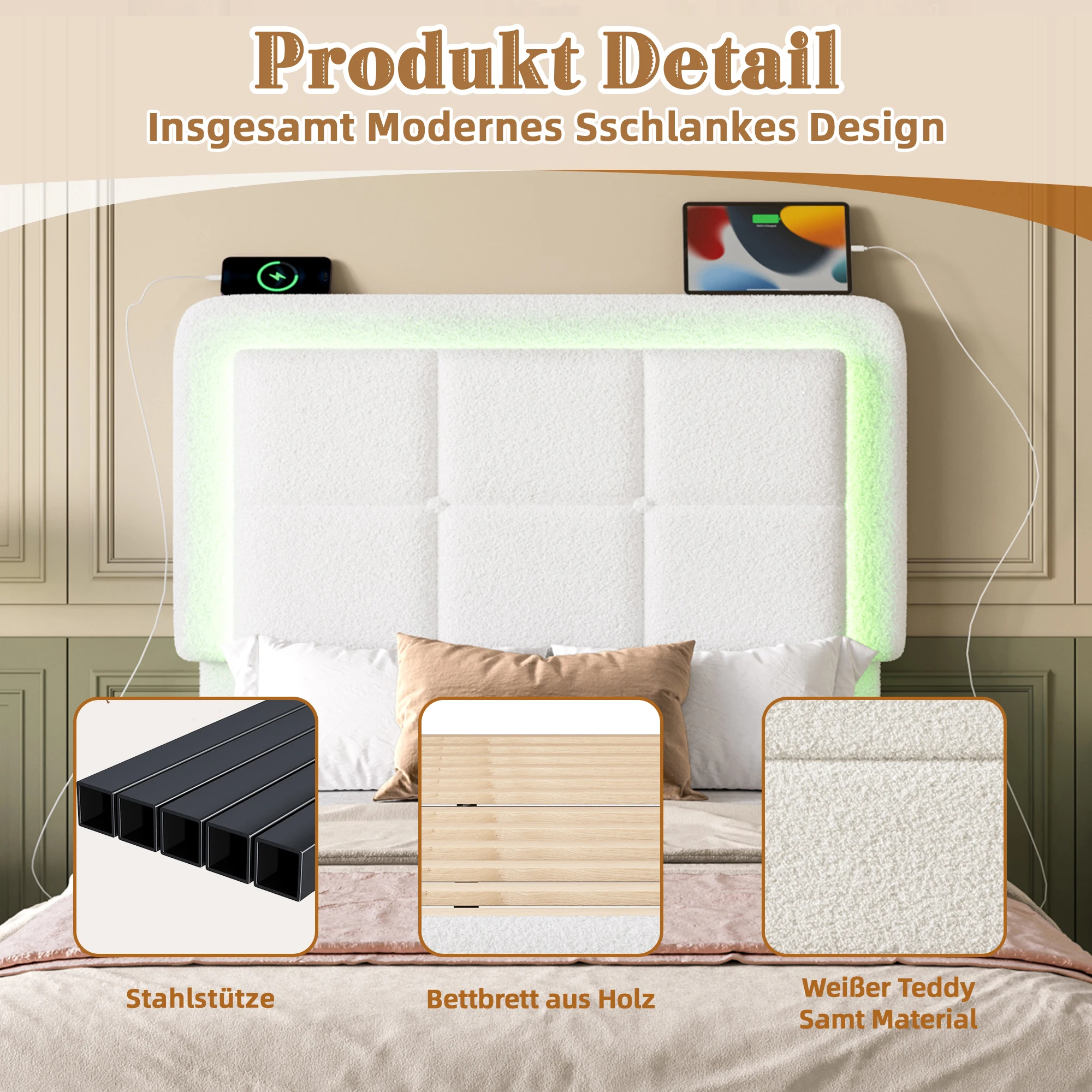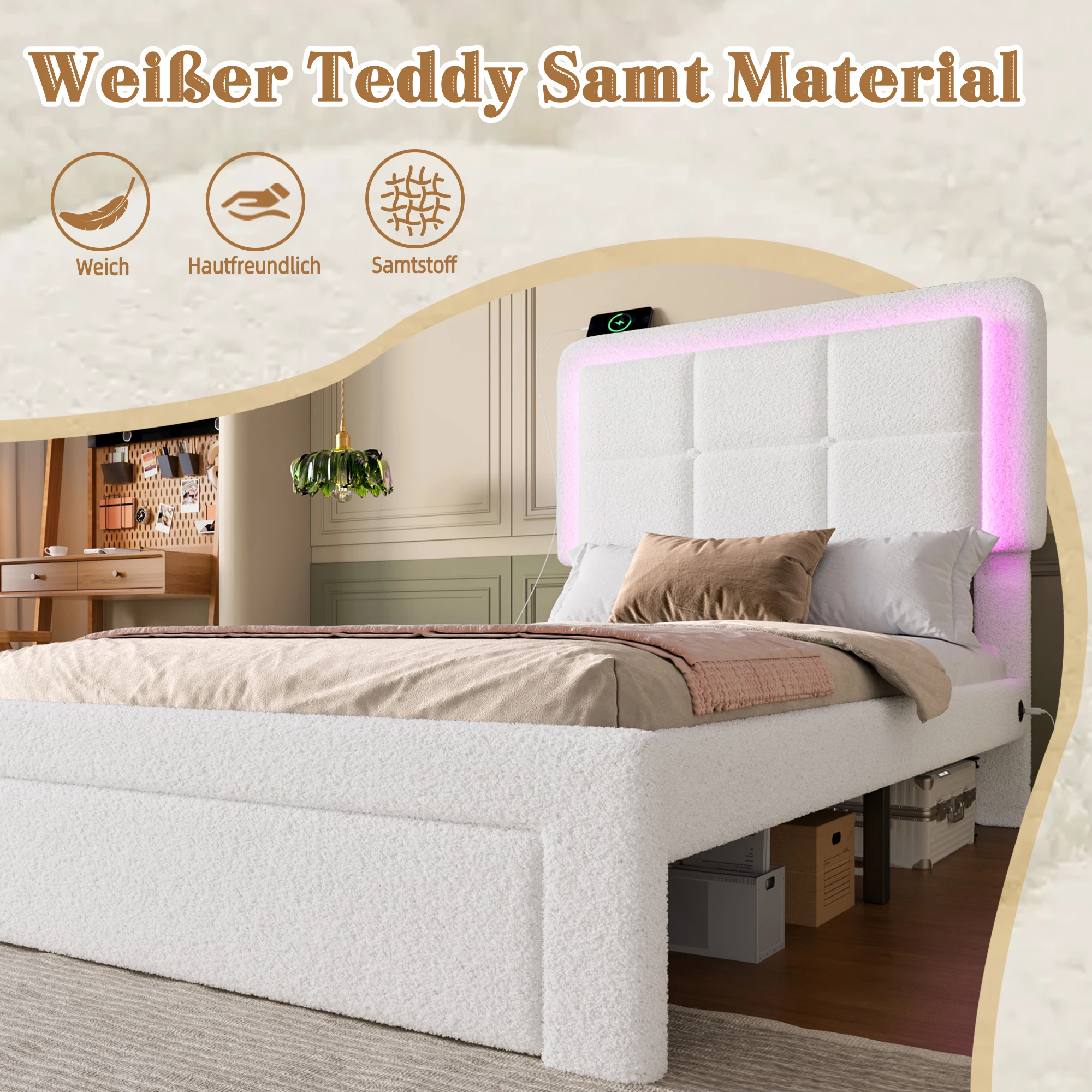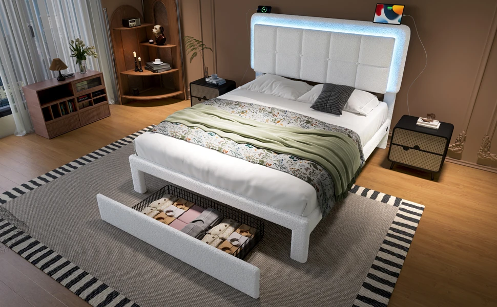 Каркас кровати с мягкой обивкой LVHOM 140×200 см, регулируемым изголовьем Тедди, бархатом, светодиодной подсветкой и USB-портом, современный каркас кровати