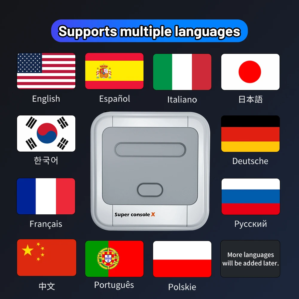 Суперконсоль x поддерживает 26 языков, включая китайский, английский, русский, испанский, португальский, японский, корейский, итальянский, французский, польский и т. д.Вы можете переключиться на знакомый вами язык в системных настройках.