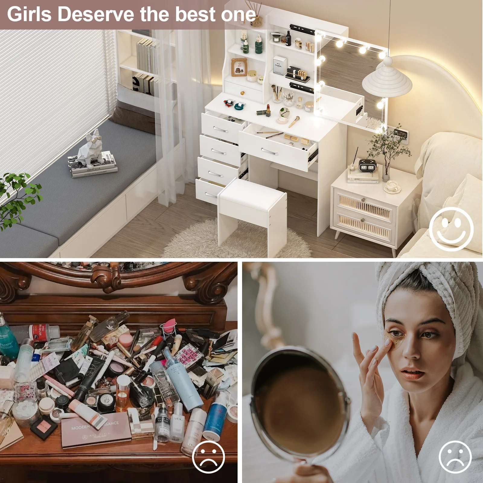 Классический деревянный туалетный столик для макияжа с зеркалом с подсветкой — 3 режима освещения, ящиками и открытым хранилищем.