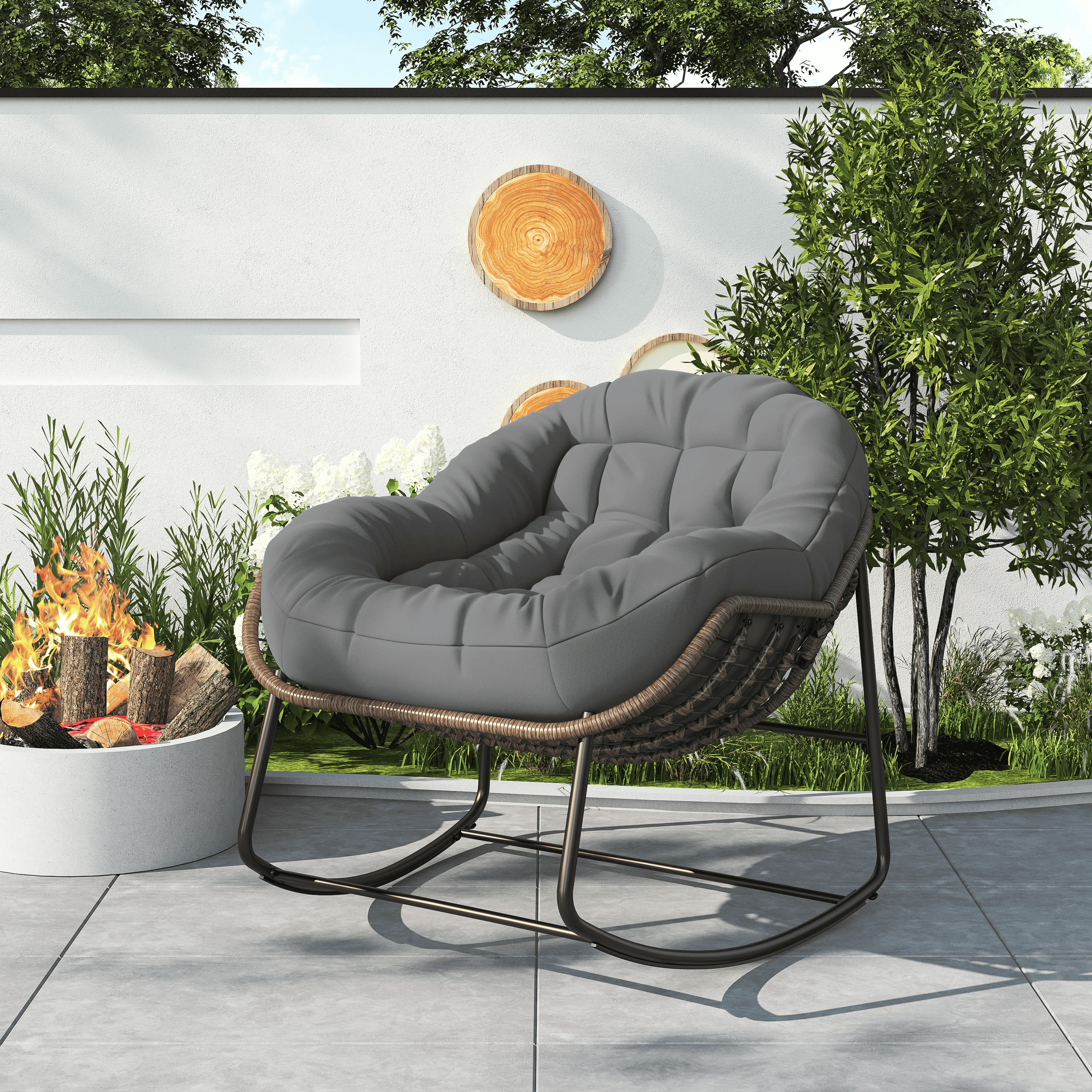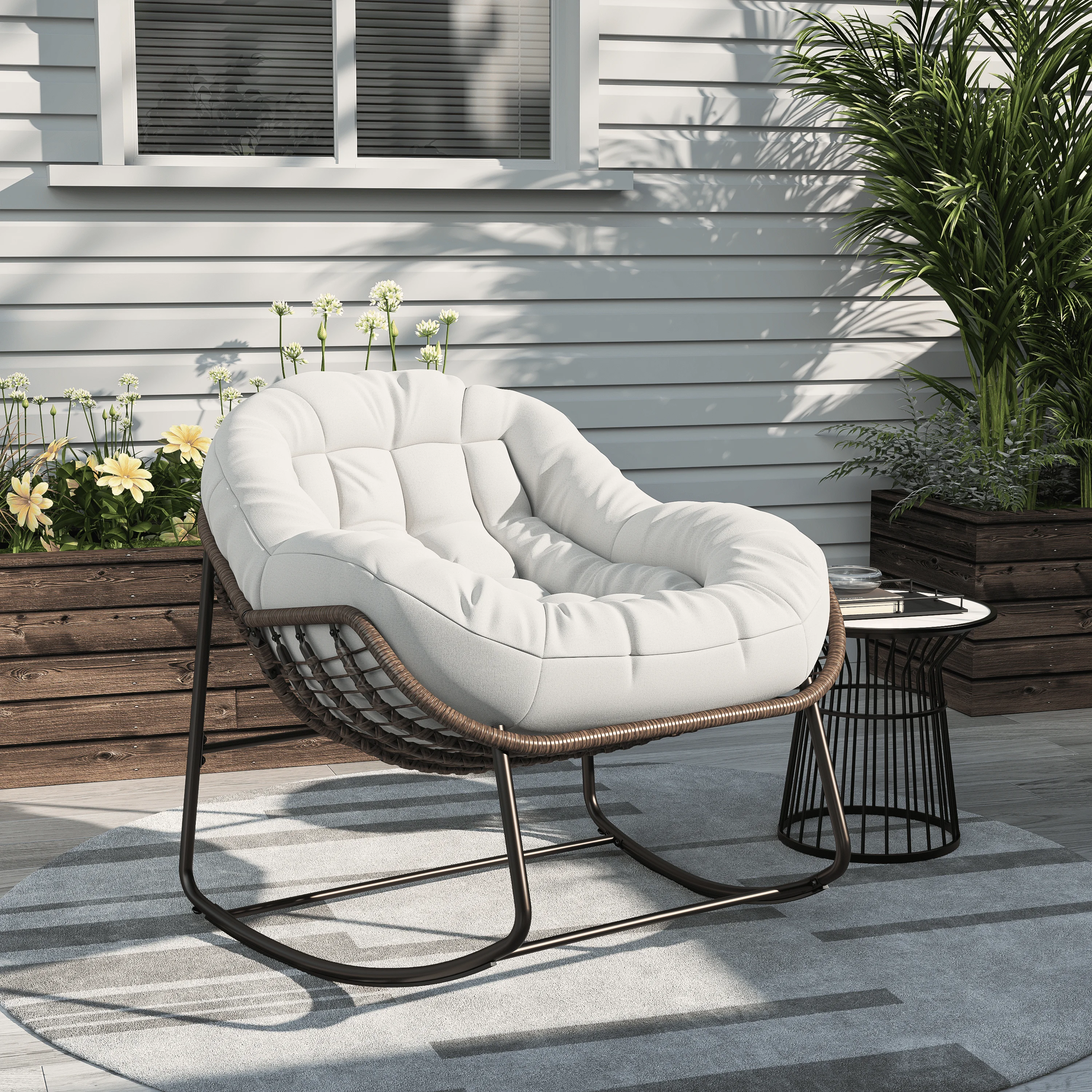 Это удобное кресло-качалка состоит из каркаса из термопокрытой стали и рутин ручной работы, выдерживающего максимальный вес 113 кг.К основанию прикреплены переключатели и противоскользящие полосы, обеспечивая безопасность при использовании на открытом воздухе.