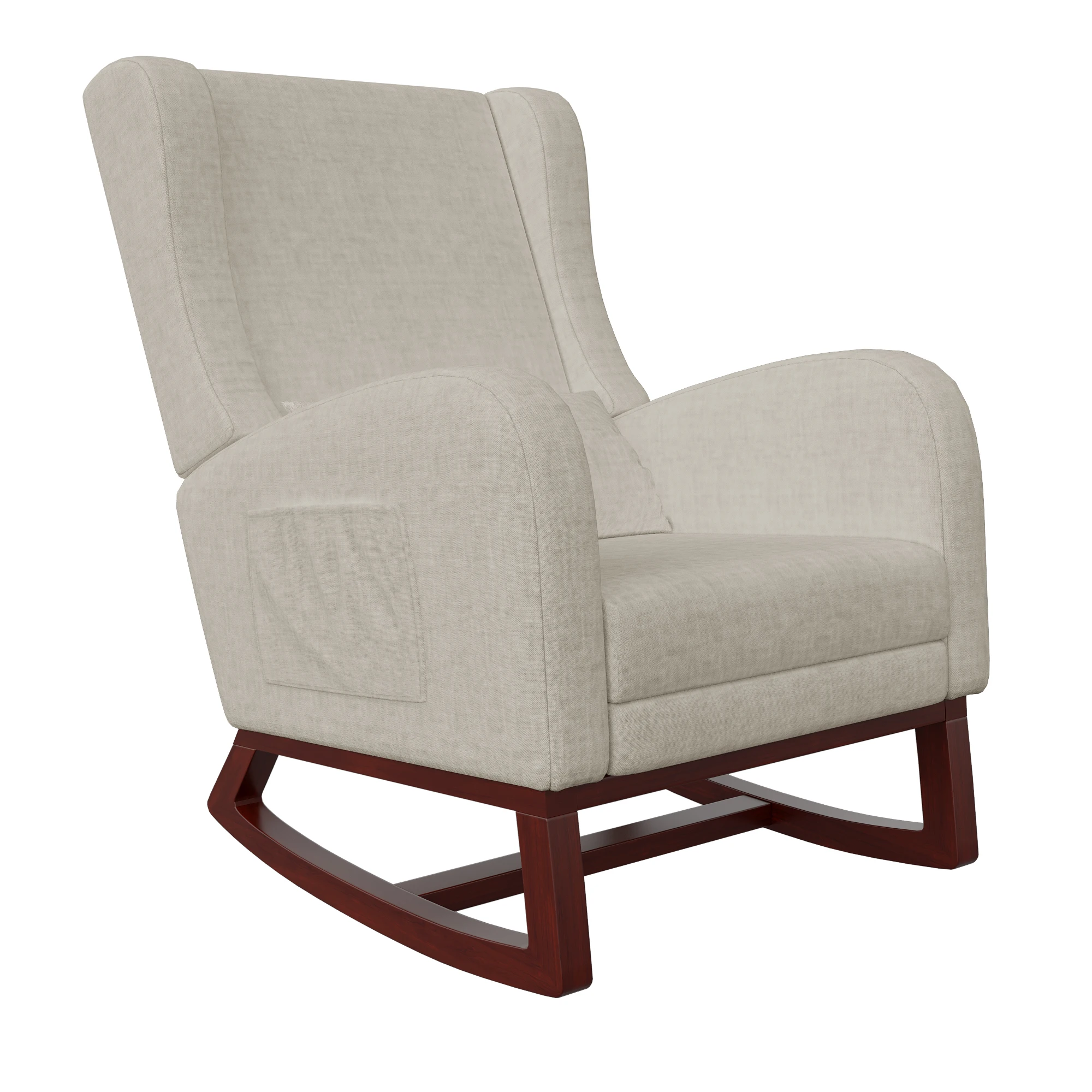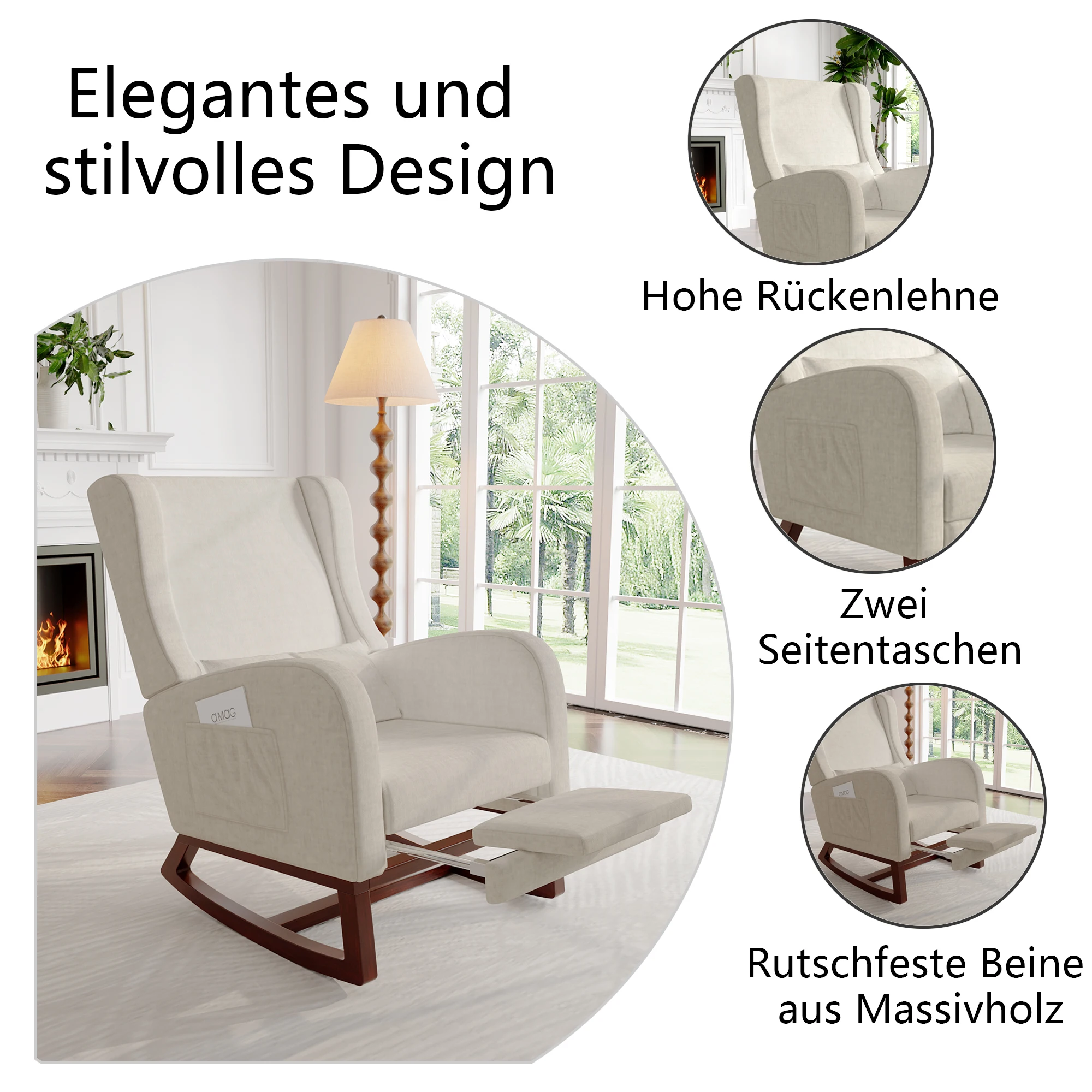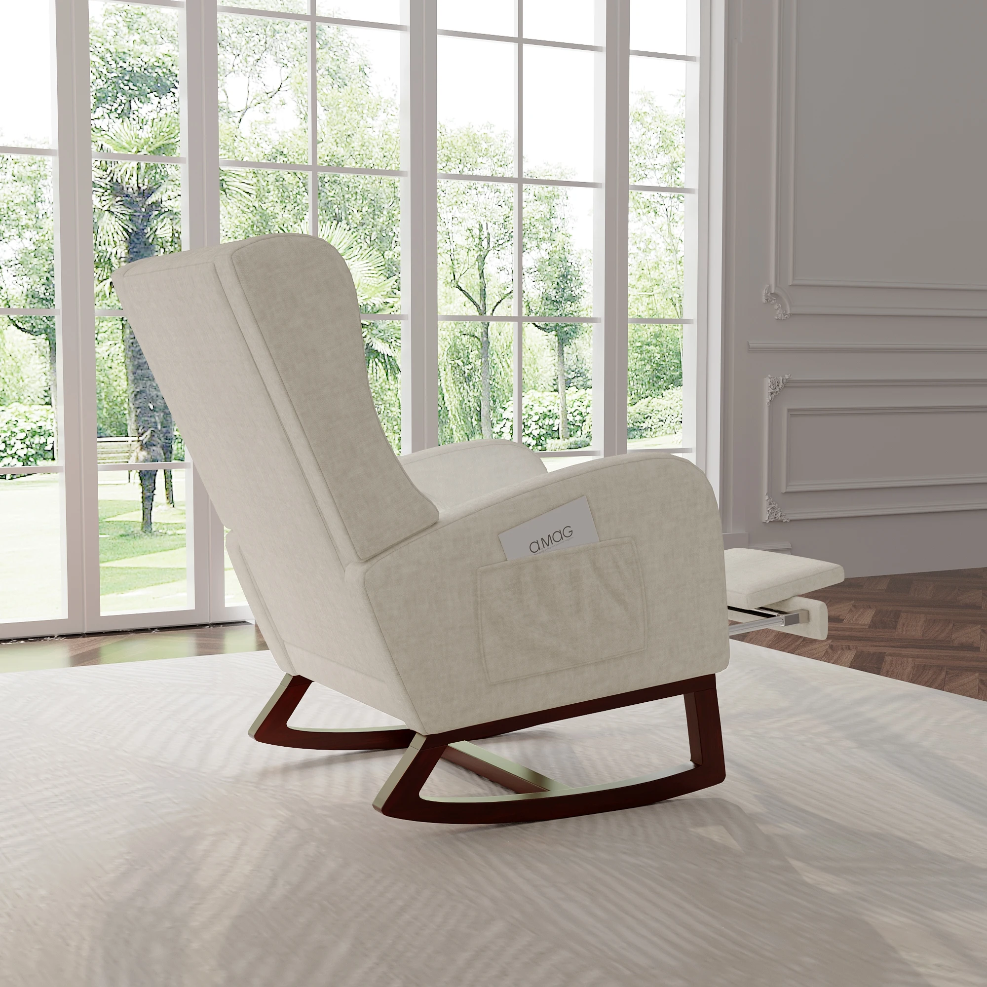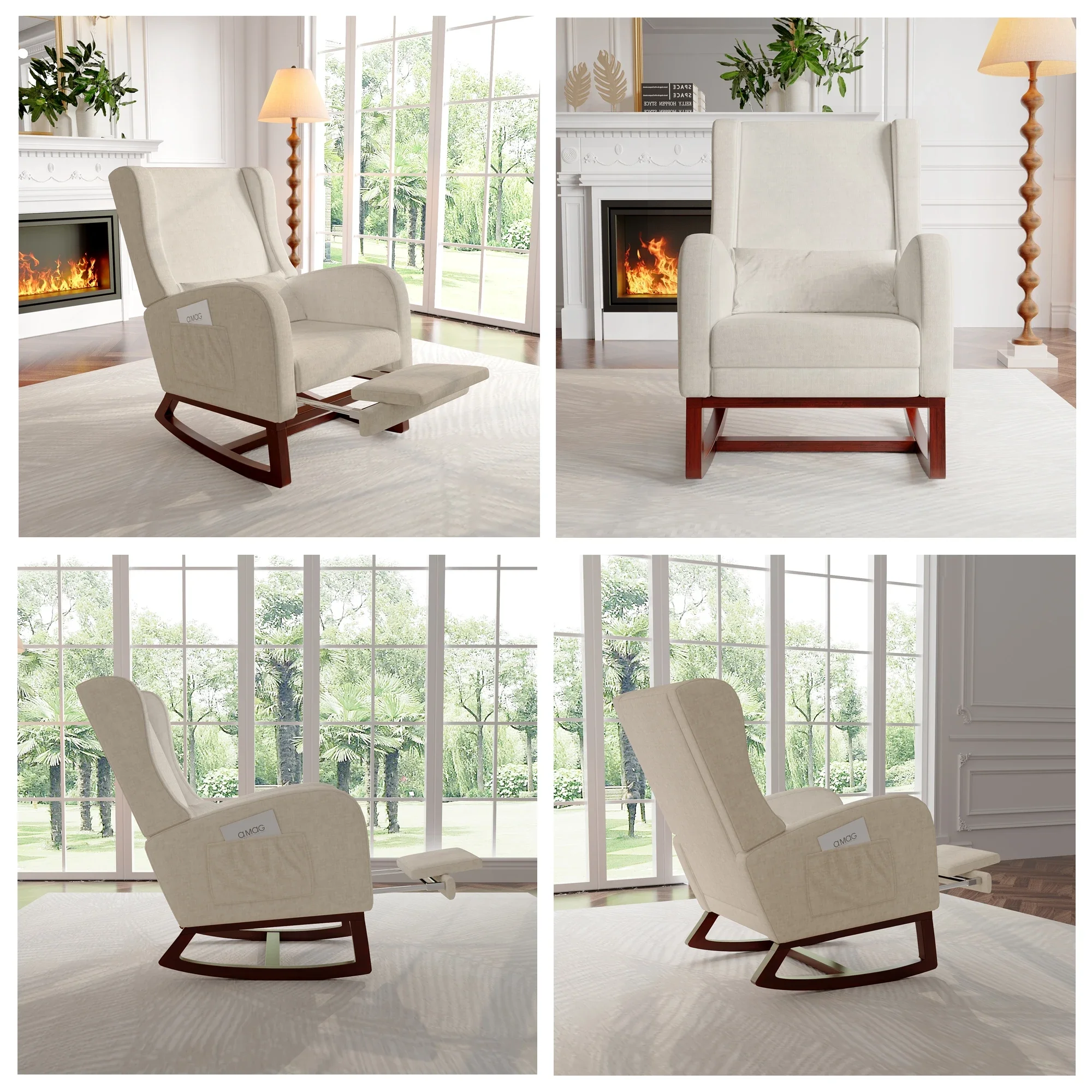 кресло-качалка, кресло с откидной спинкой и подставкой для ног, кресло-качалка из бежевого льна, эргономичное кресло с высокой спинкой, кресло с деревянным основанием, кресло для отдыха с карманами, кресло для гостиной, кресло-качалка для спальни, кресло-качалка для детской, современное кресло-качалка