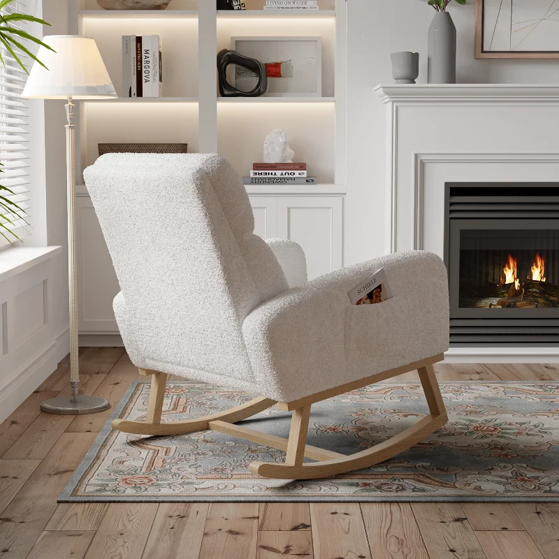 1.Кресло-качалка изготовлено из белого материала из овечьей шерсти, мягкого и удобного.