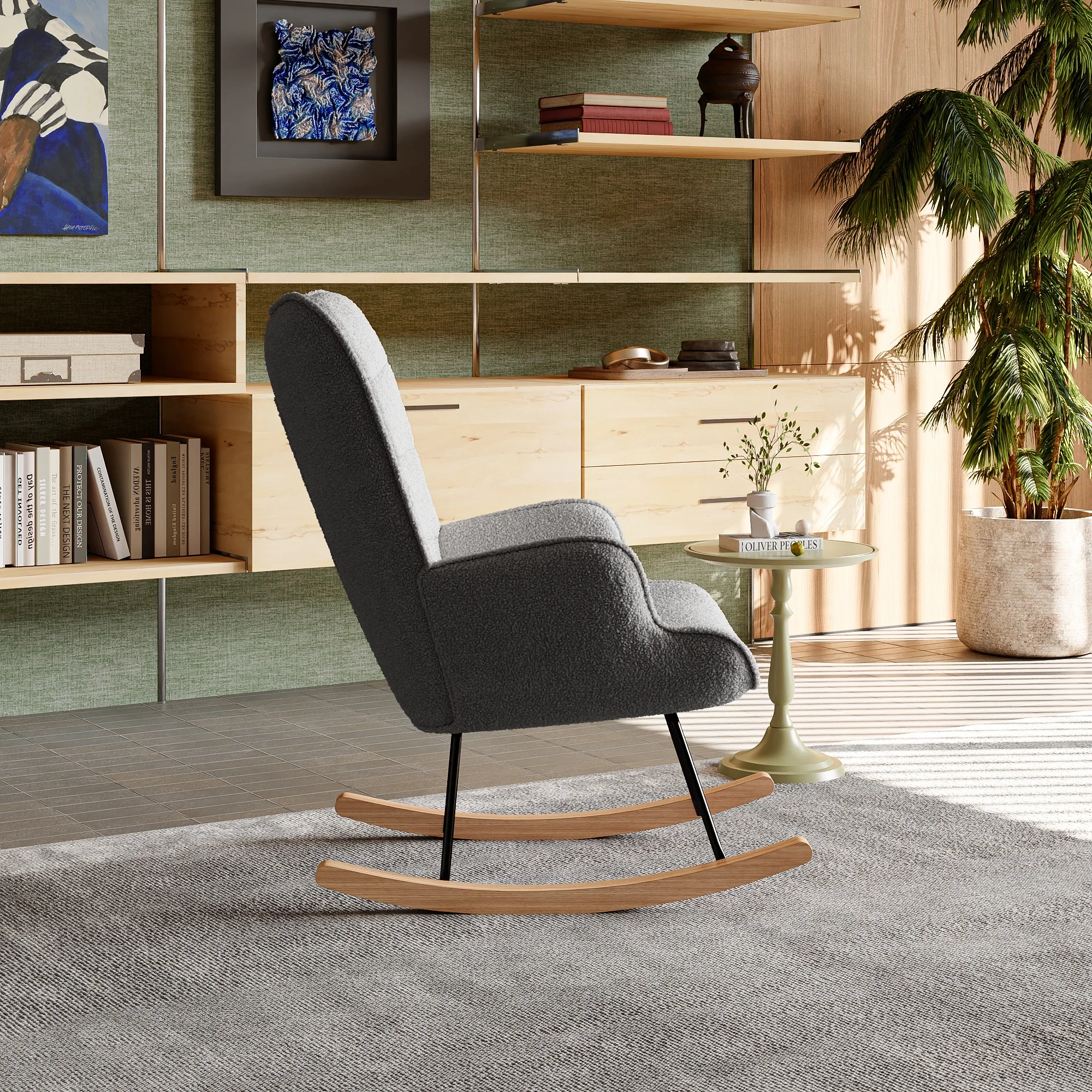 2.Уникальный дизайн кресла-качалки: это кресло-качалка сочетает в себе современный вид и основание из натурального дерева.Он отличается элегантными изгибами и ощущением моды, что делает его подходящим для различных стилей дома.