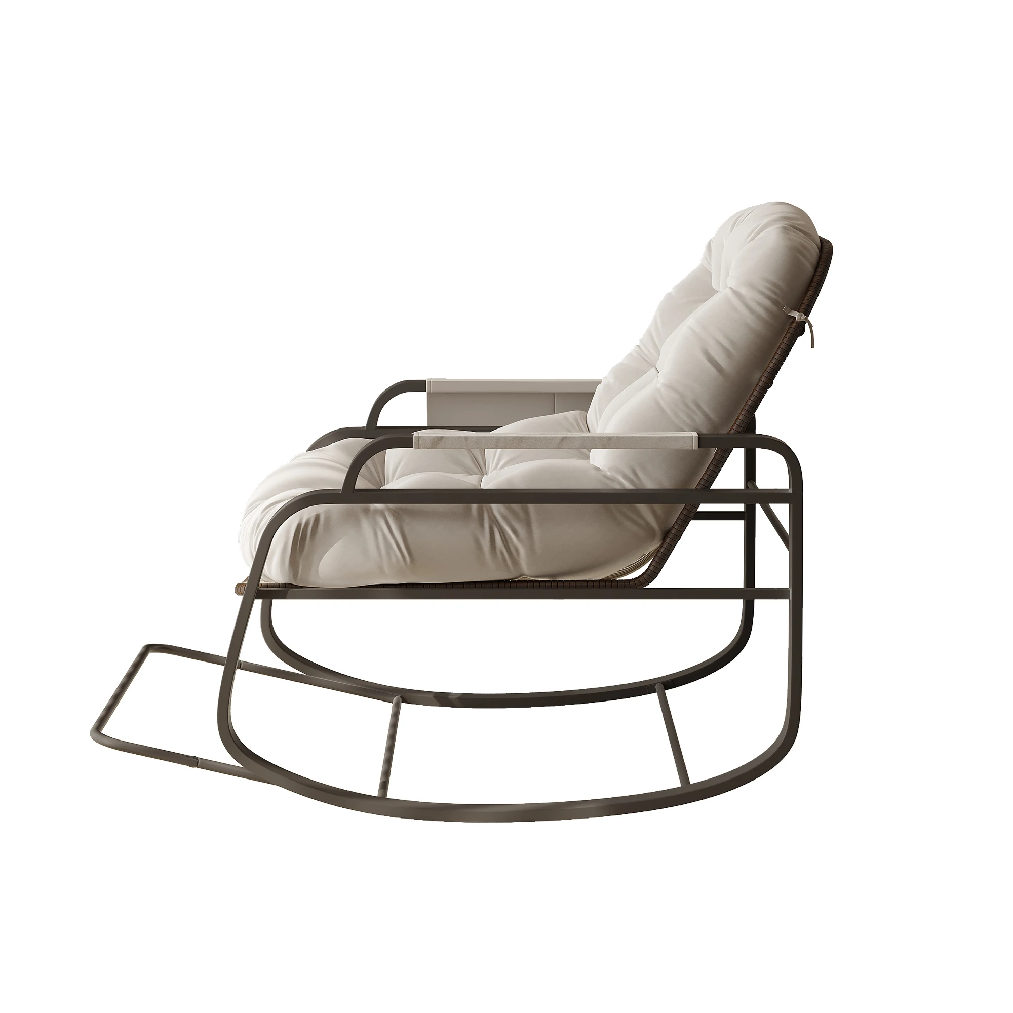 Прочная конструкция и современный дизайн:Каркас изготовлен из высококачественного металла, что гарантирует высокую прочность. Его современный и чистый дизайн, сочетающий в себе темно-коричневый металл, рутин и бежевую подушку, идеально вписывается в любую гостиную, спальню или балкон.