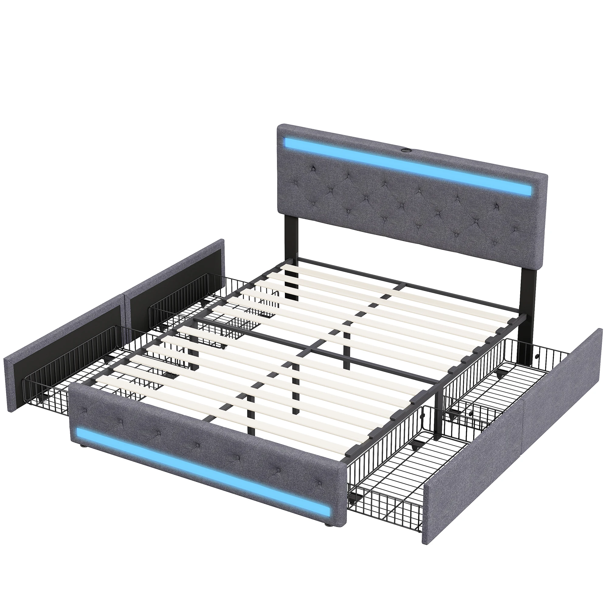 Кровать Comanlai с обивкой, 140×200 см, с USB-зарядкой в изголовье, светодиодной подсветкой и 4 ящиками, двуспальная кровать