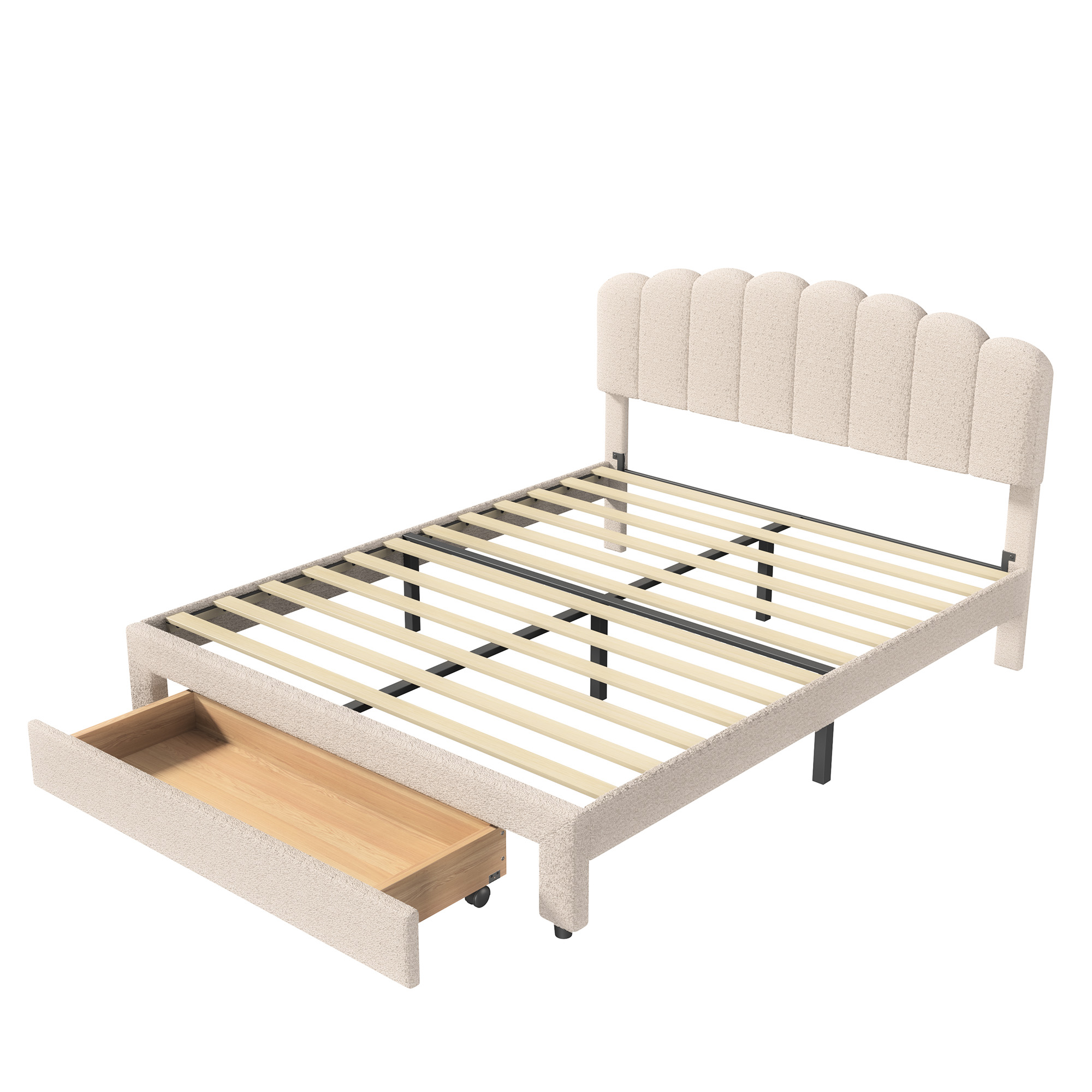 Кровать с мягкой обивкой, двуспальная кровать с USB Type C, Кровать для хранения с большими ящиками и изголовьем, каркас кровати с решетчатым основанием, бежевый