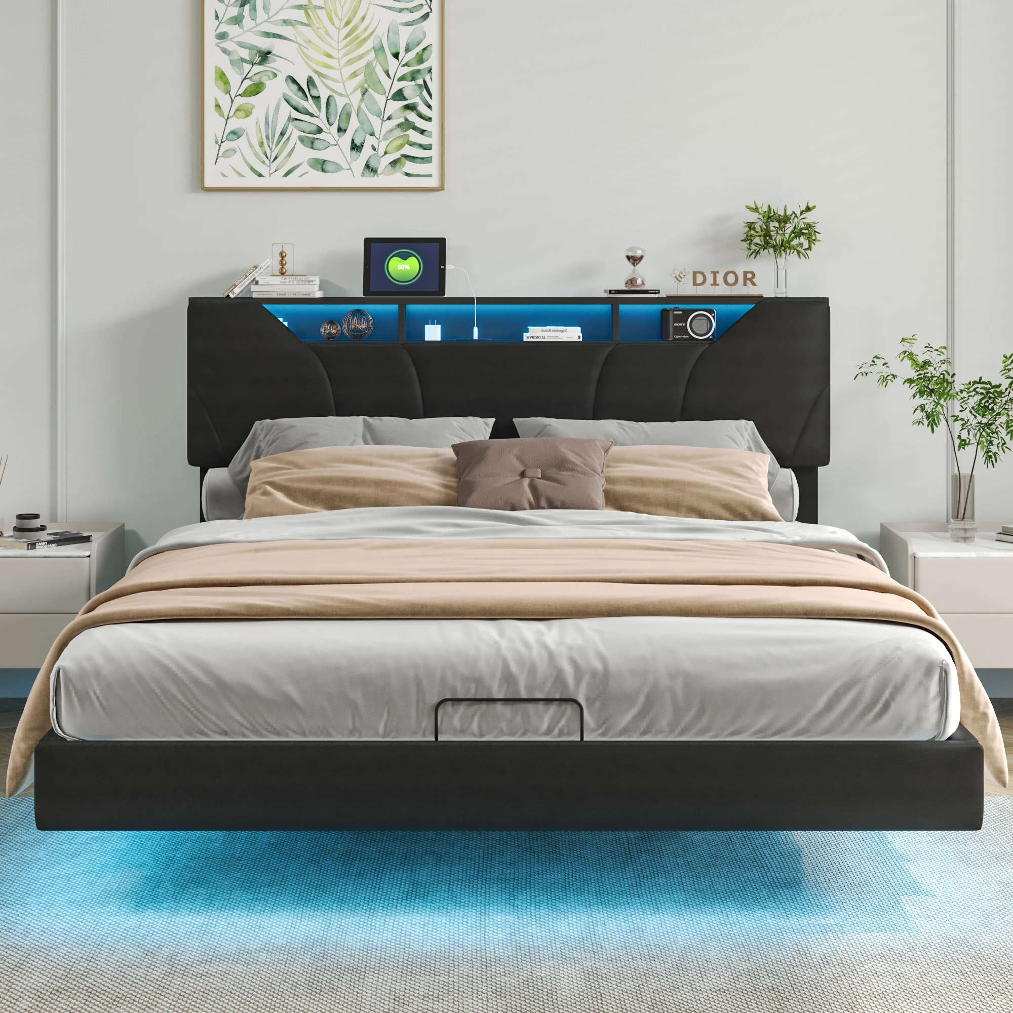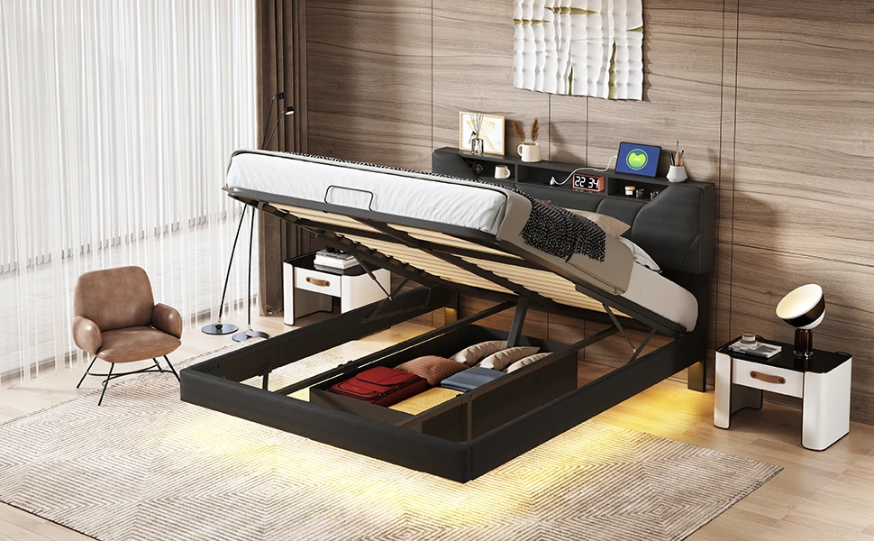 Кровать с мягкой обивкой, Кровать для хранения со светодиодной подсветкой, USB-розетка, стержень для давления воздуха, Изголовье двуспальной кровати с местом для хранения вещей, Черный