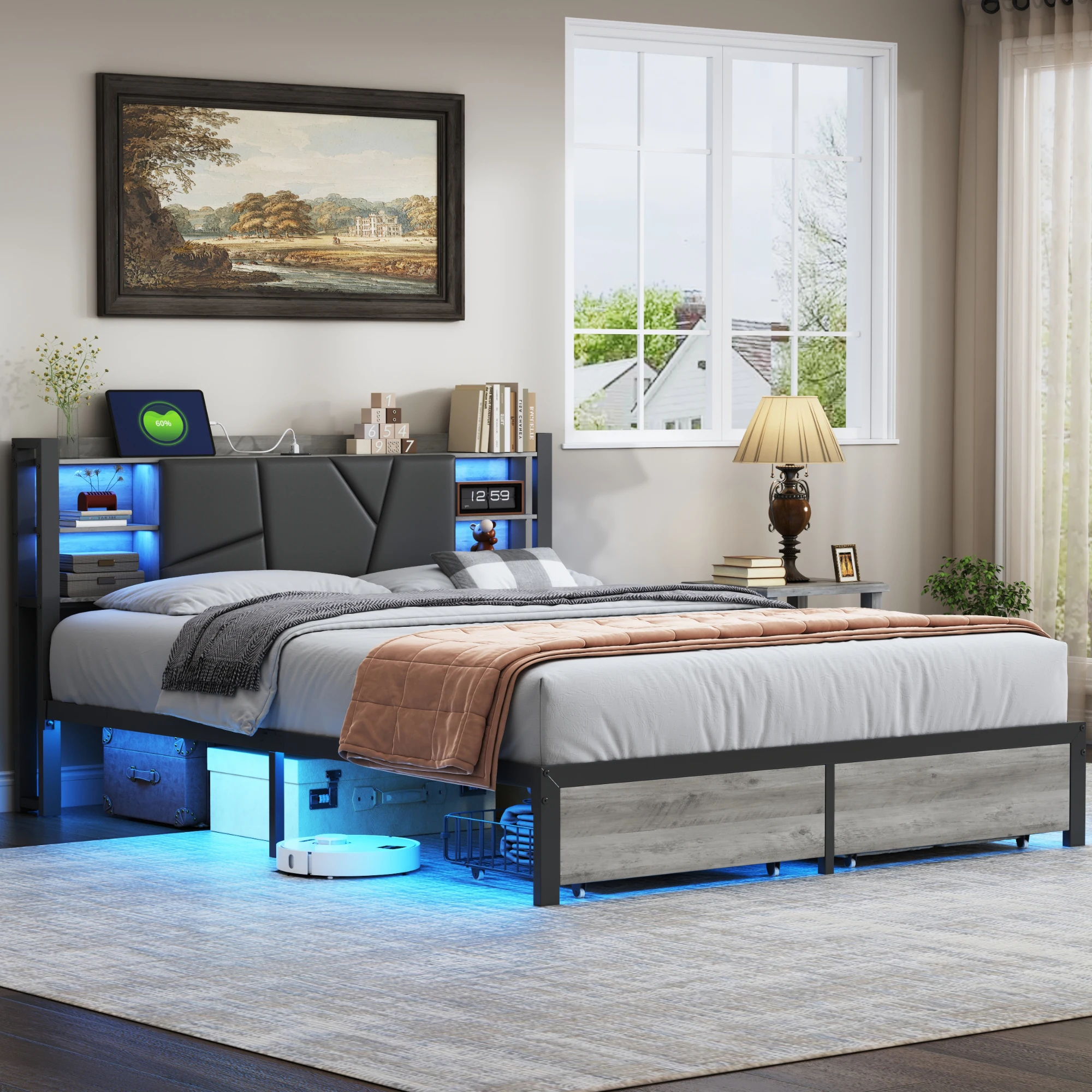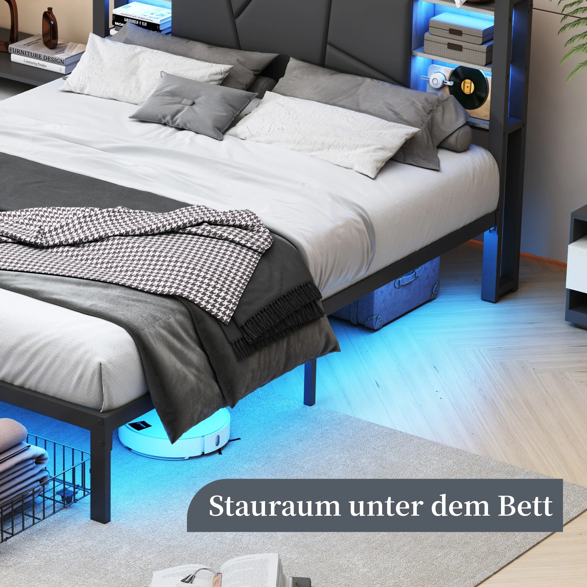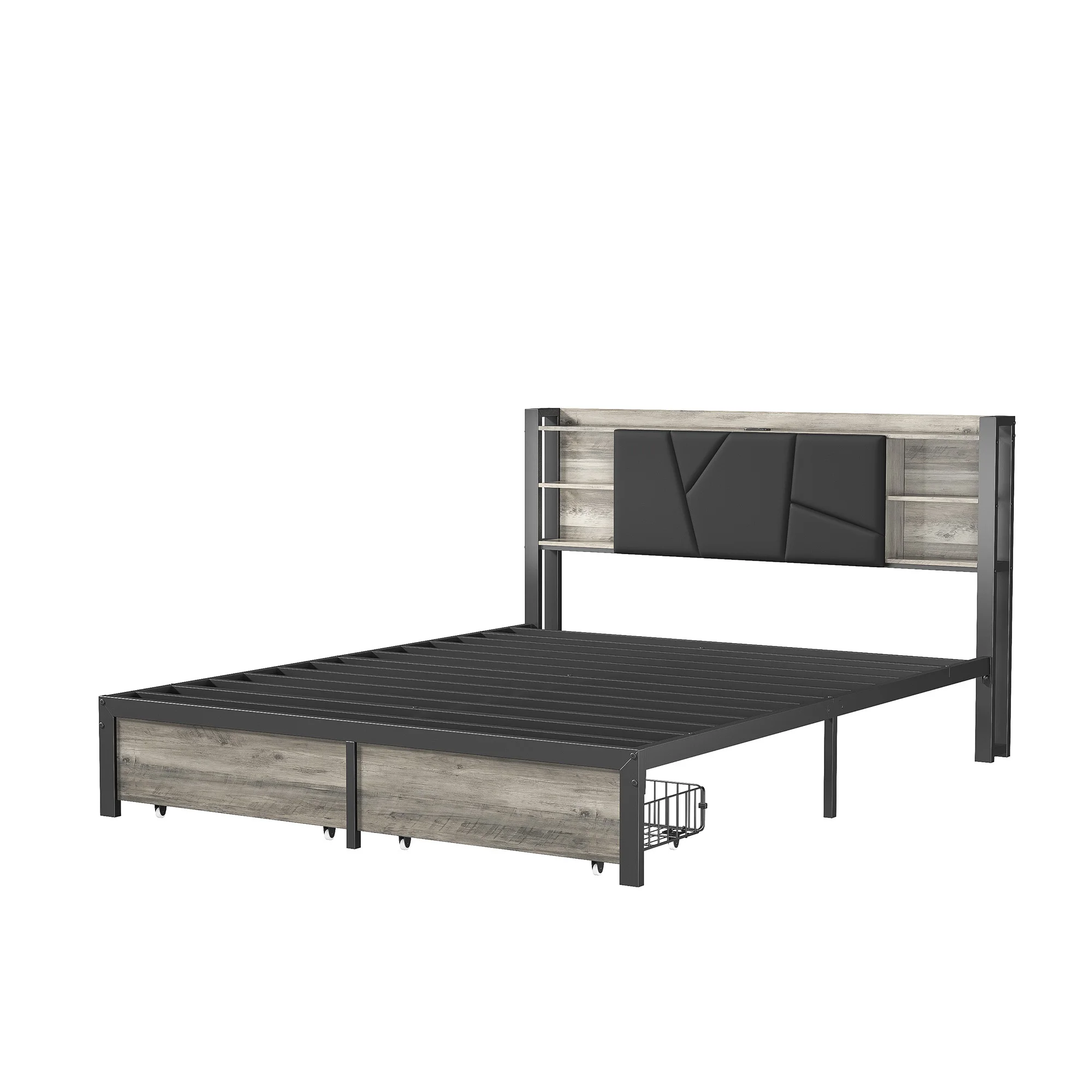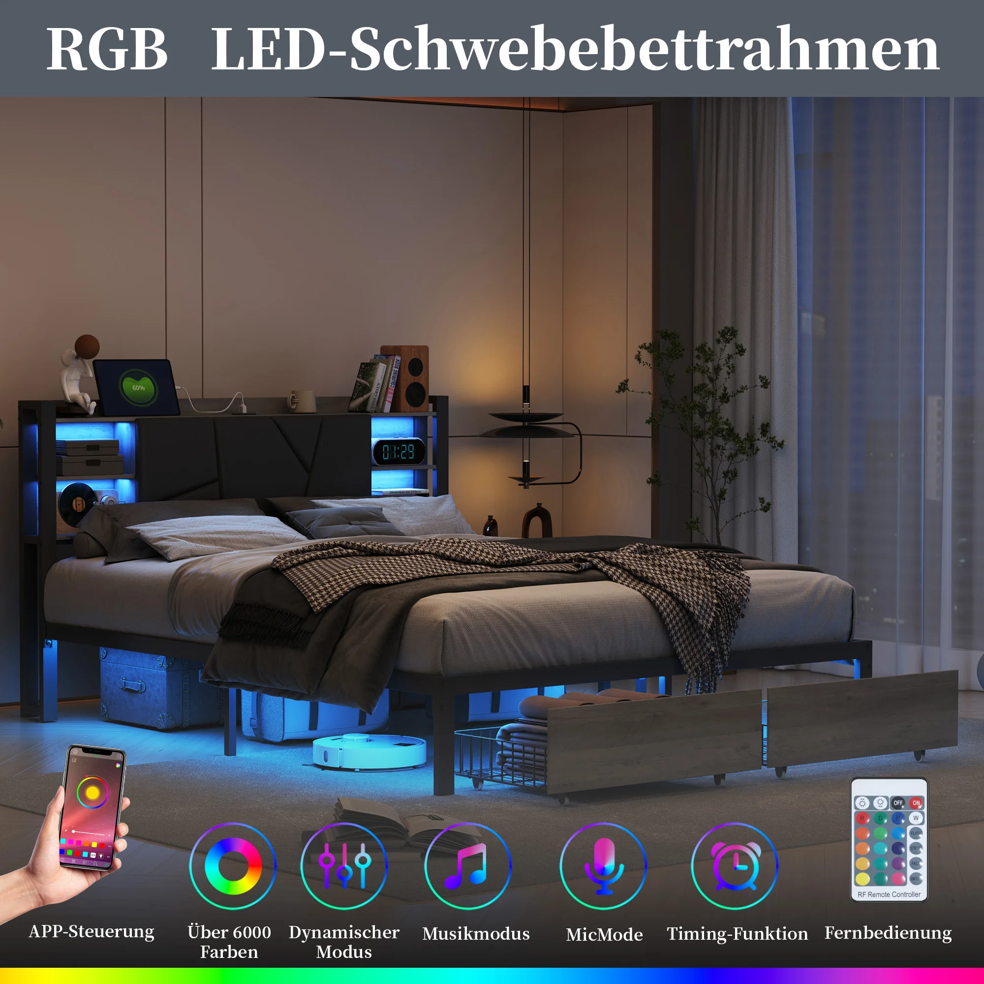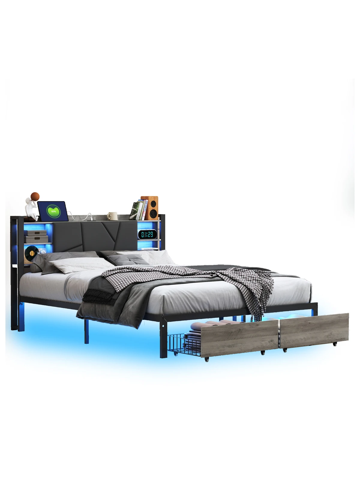 Кровать с обивкой 140×200 см. Двуспальная кровать со светодиодной подсветкой. Металлическая кровать с 2 ящиками и решетчат
