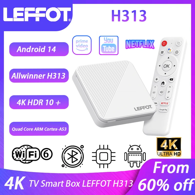 LEFFOT H313 Android 14 Smart TV Box ATV TV Box 4K@60fps 100M/LAN Wifi6 BT5.0 Google Voice Assistant Медиаплеер Set Top Box