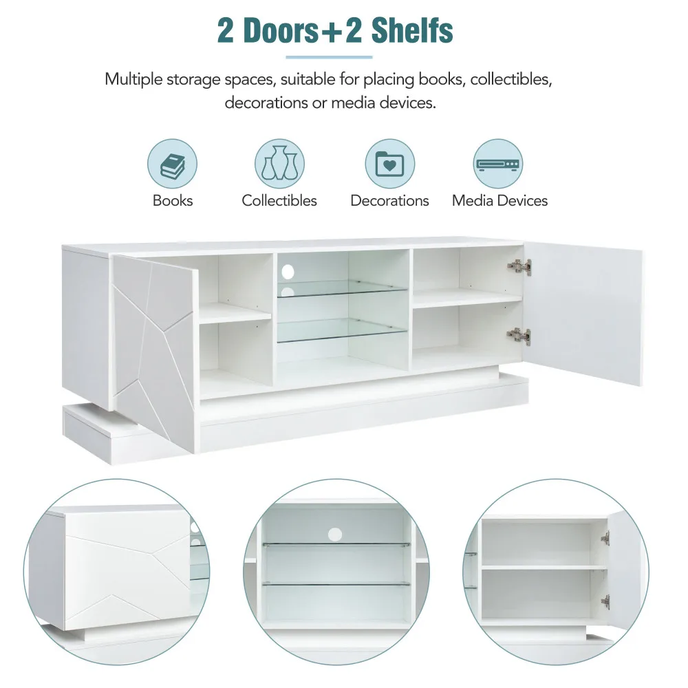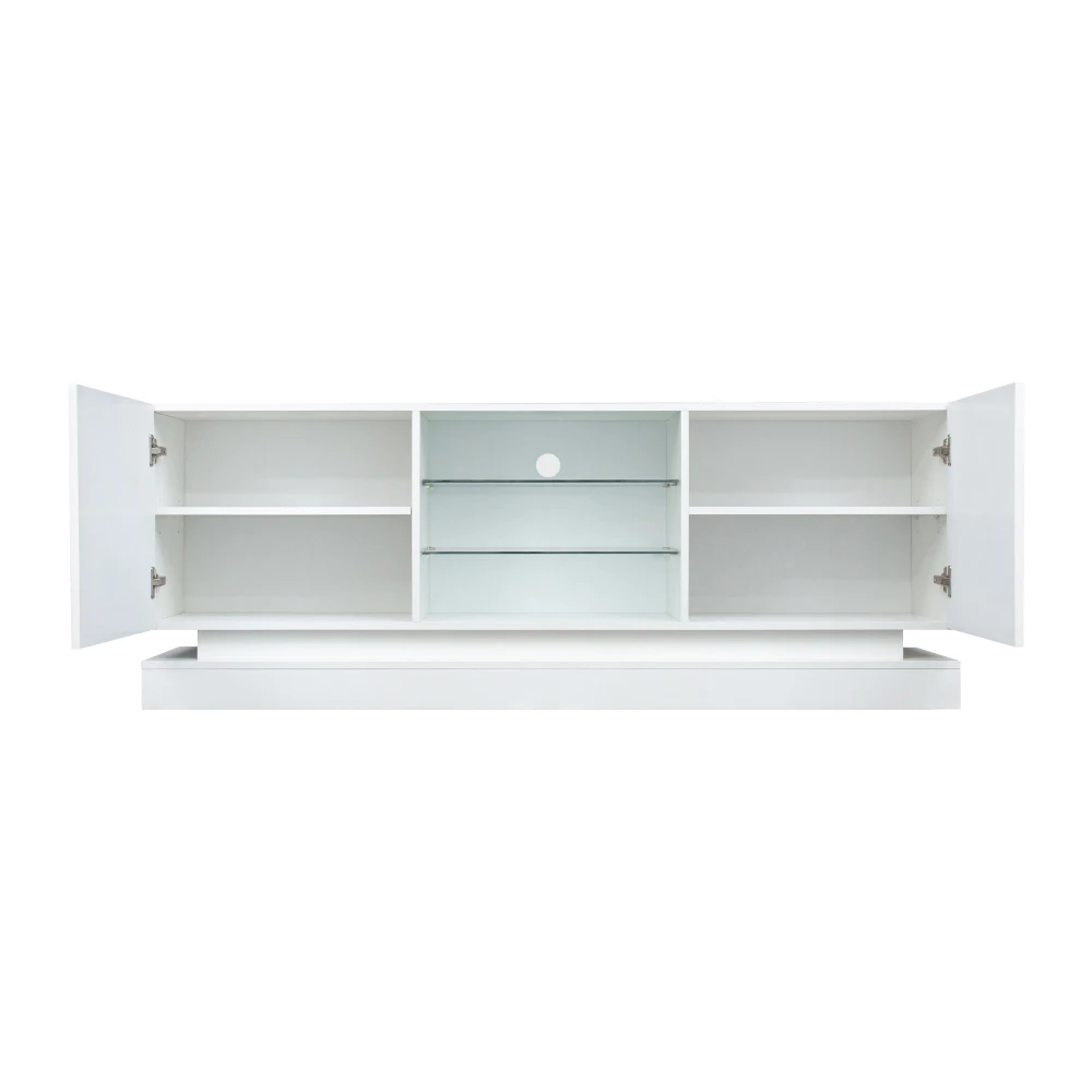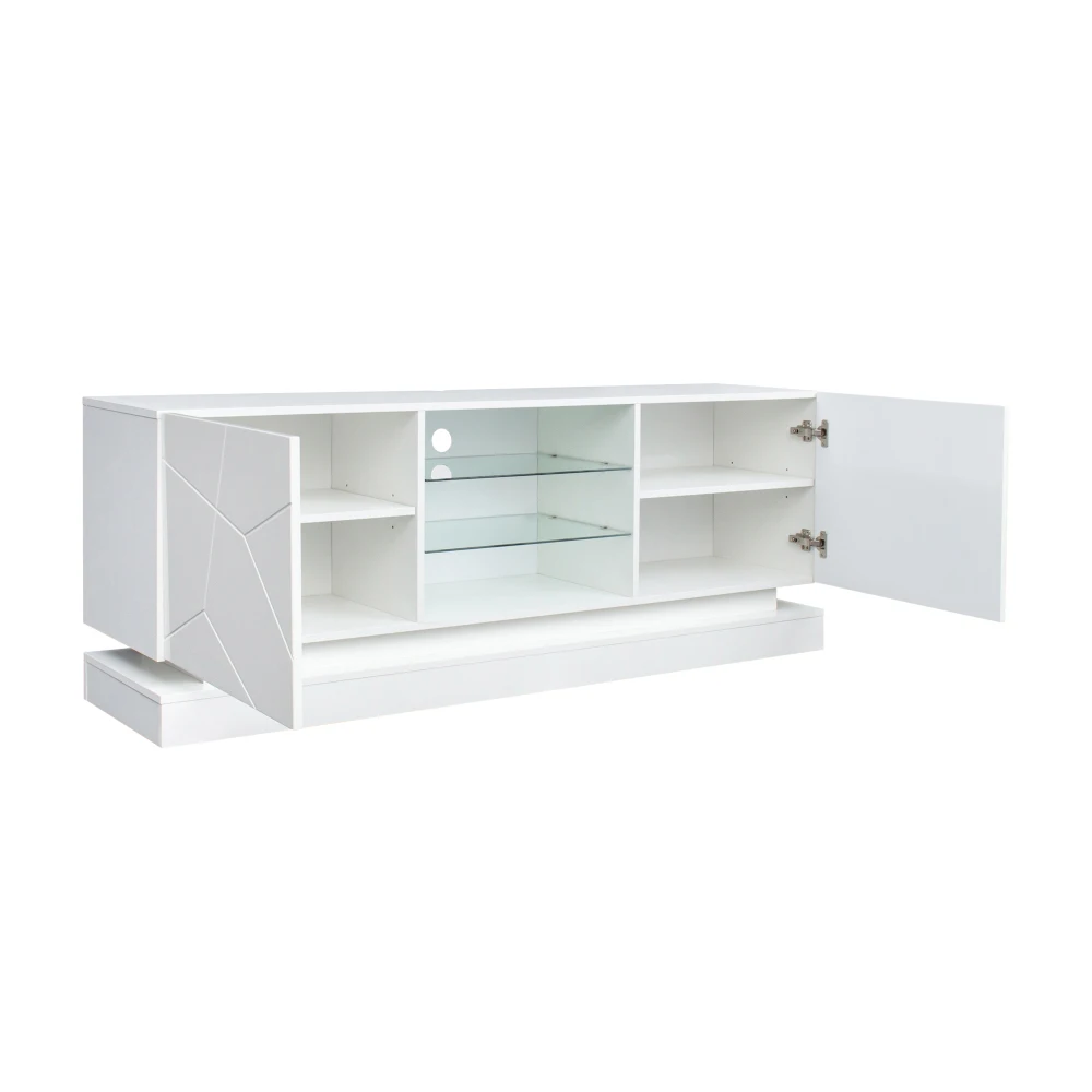 Матово-белая подставка для телевизора 160 см с синей подсветкой — регулируемые стеклянные полки и бесшумные петли для хранения телевизоров 70 дюймов