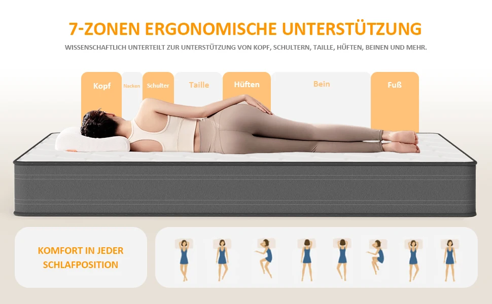 7-зонная система регулирует поддержку различных участков давления плеч, талии и бедер: гибкий рельеф для плеч и бедер, целенаправленная поддержка в области поясницы – для естественной и удобной осанки без судорог.