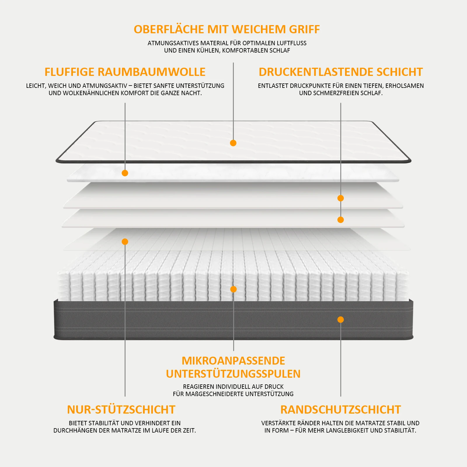 Благодаря пружинам, изготовленным из трех проволоки различной толщины (1,8 мм/2,1 мм), матрас обеспечивает гибкое сочетание эластичности и стабильности — идеально подходит для различных положений сна от бока до спины.
