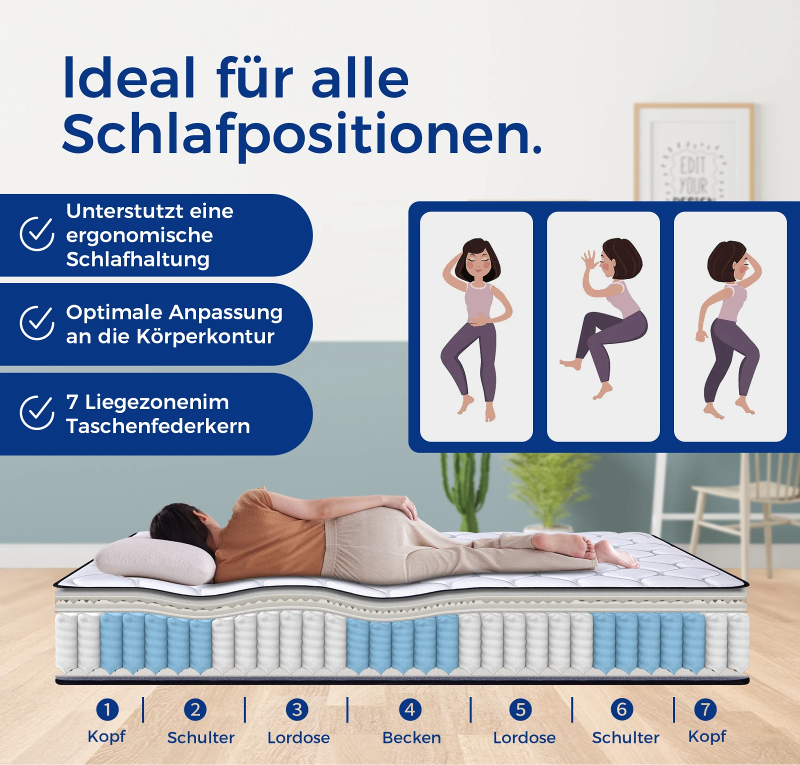 Матрасы Anajqaqia 90-180×200 см, матрас с карманными пружинами, толщина H3, 20 см, уплотнение Oeko TEX, с чехлом из лиоцелла, 7-зонный матрас
