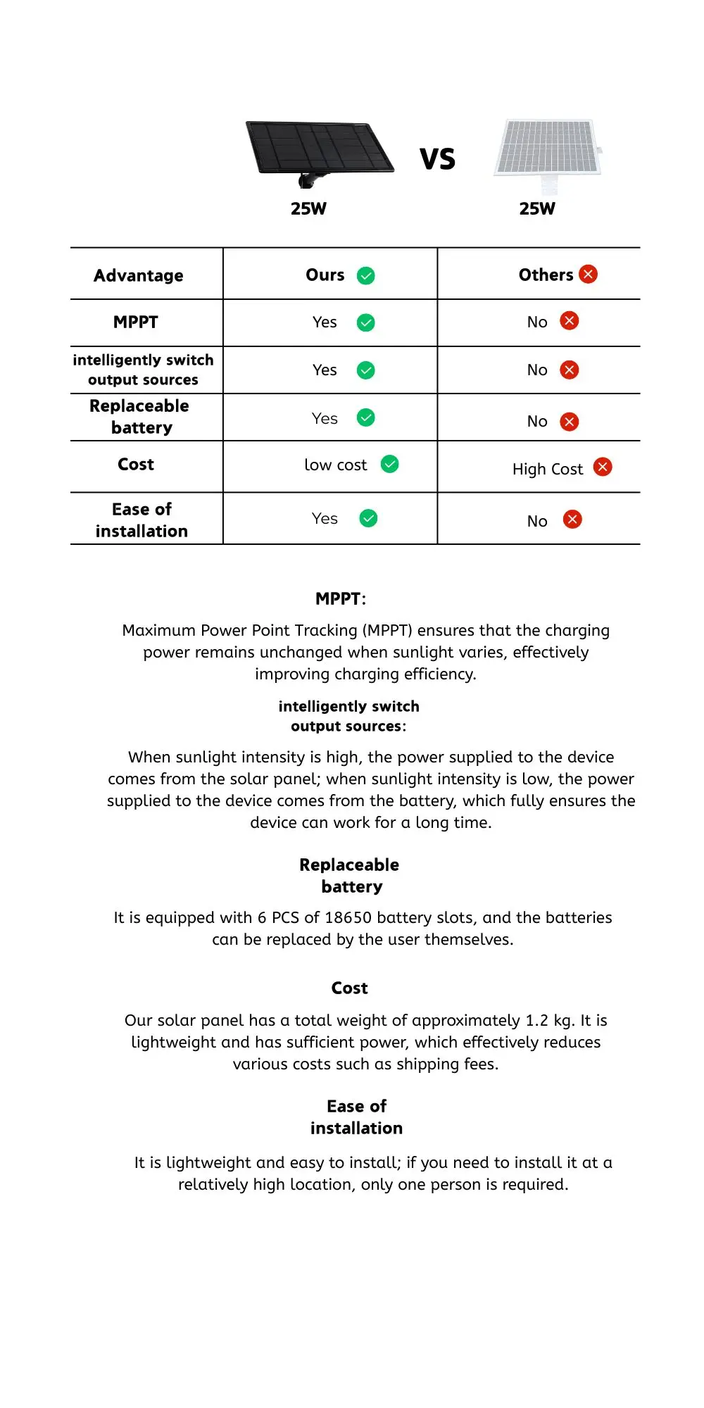 Стоимость: Общий вес нашей солнечной панели составляет около 1,2 кг.Он легкий и имеет достаточную мощность, что эффективно снижает различные расходы, такие как стоимость доставки.