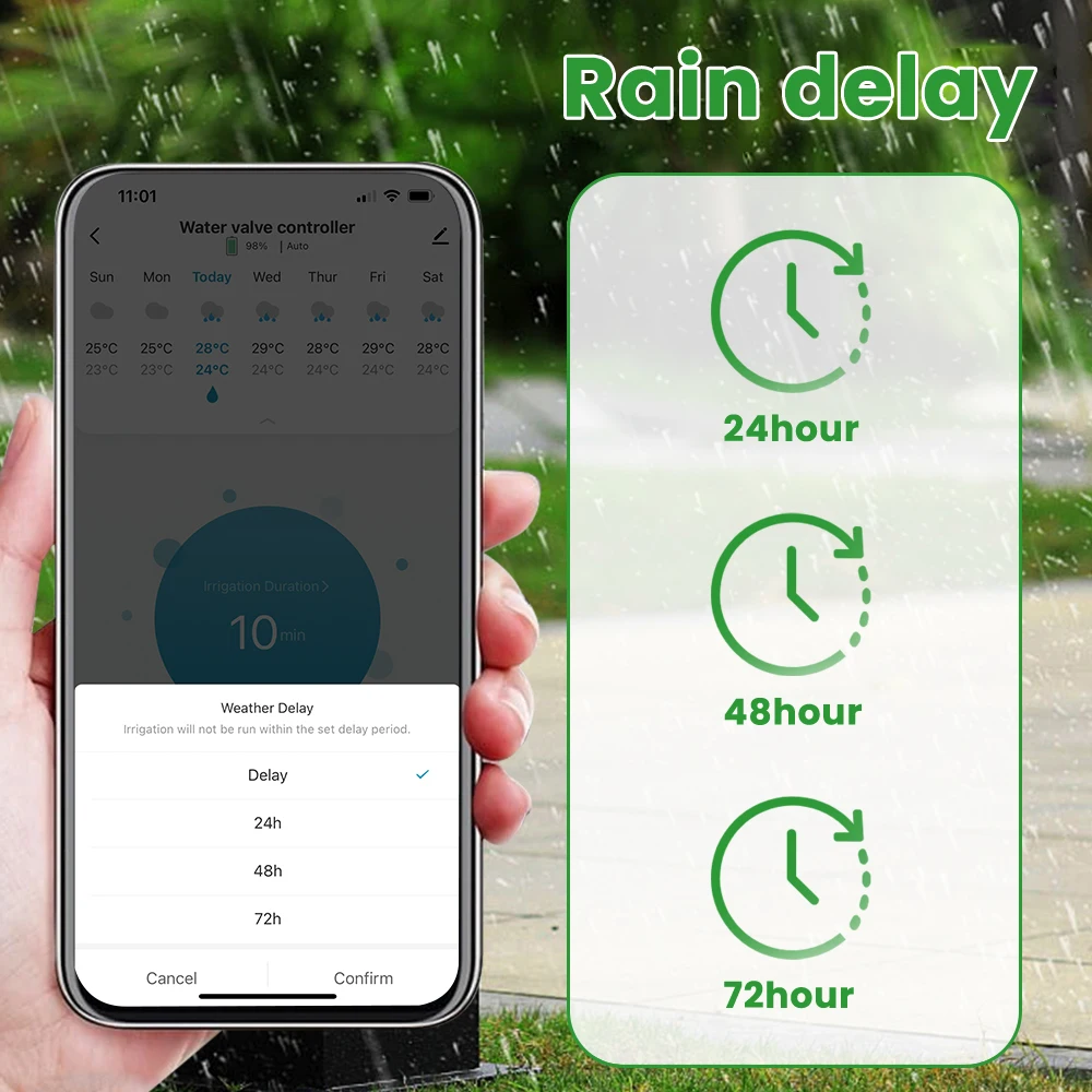 Когда идет дождь, вы можете легко установить в приложении задержку 24/48/72 часов, прежде чем выполнять график полива.