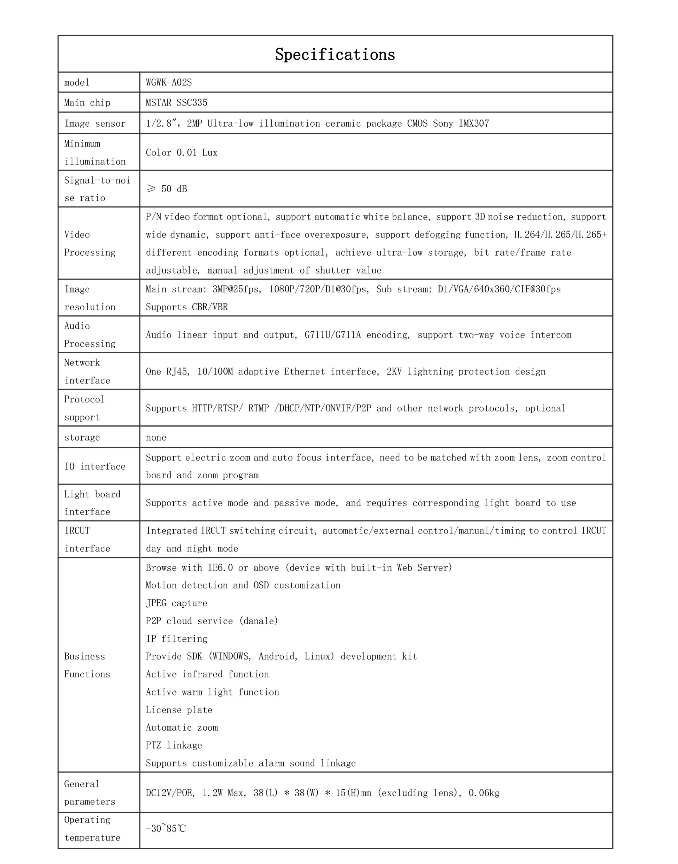 DC12V/POE, 1.2W Max, 38*38*15mm excluding lens, 0.06kg |