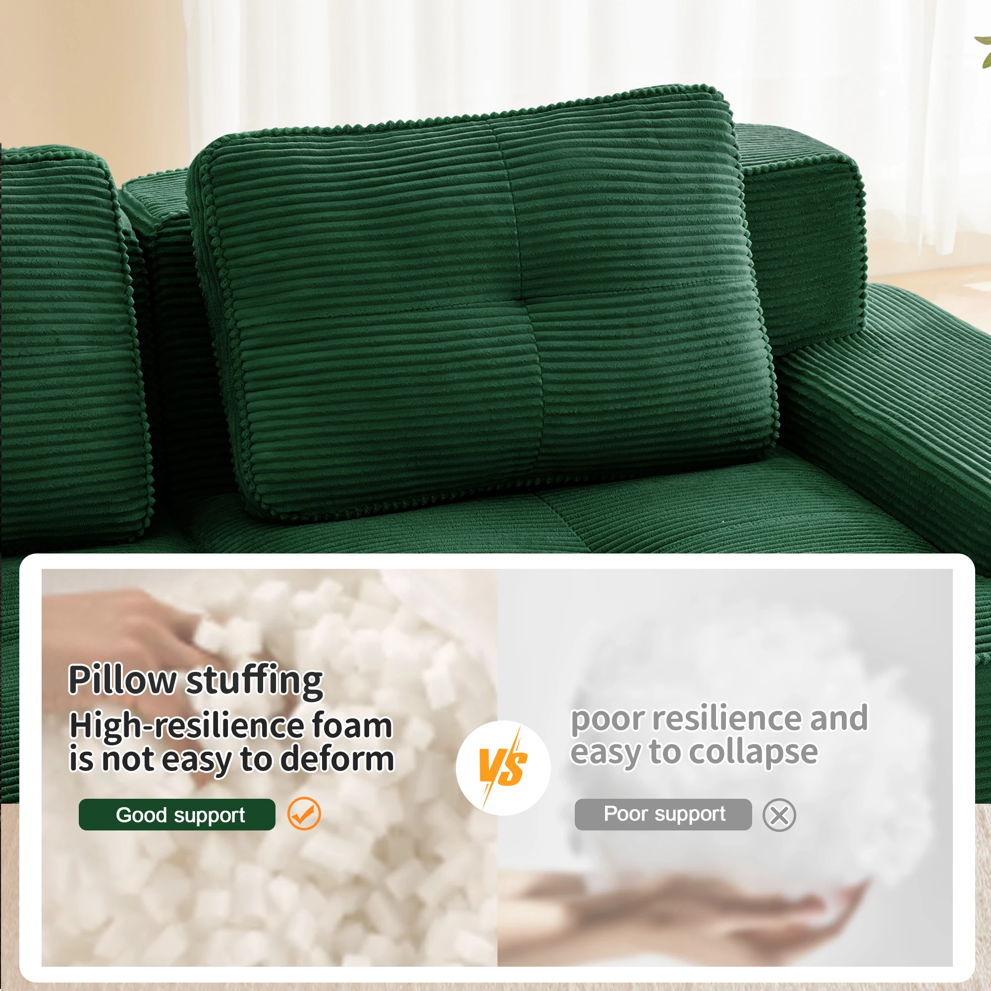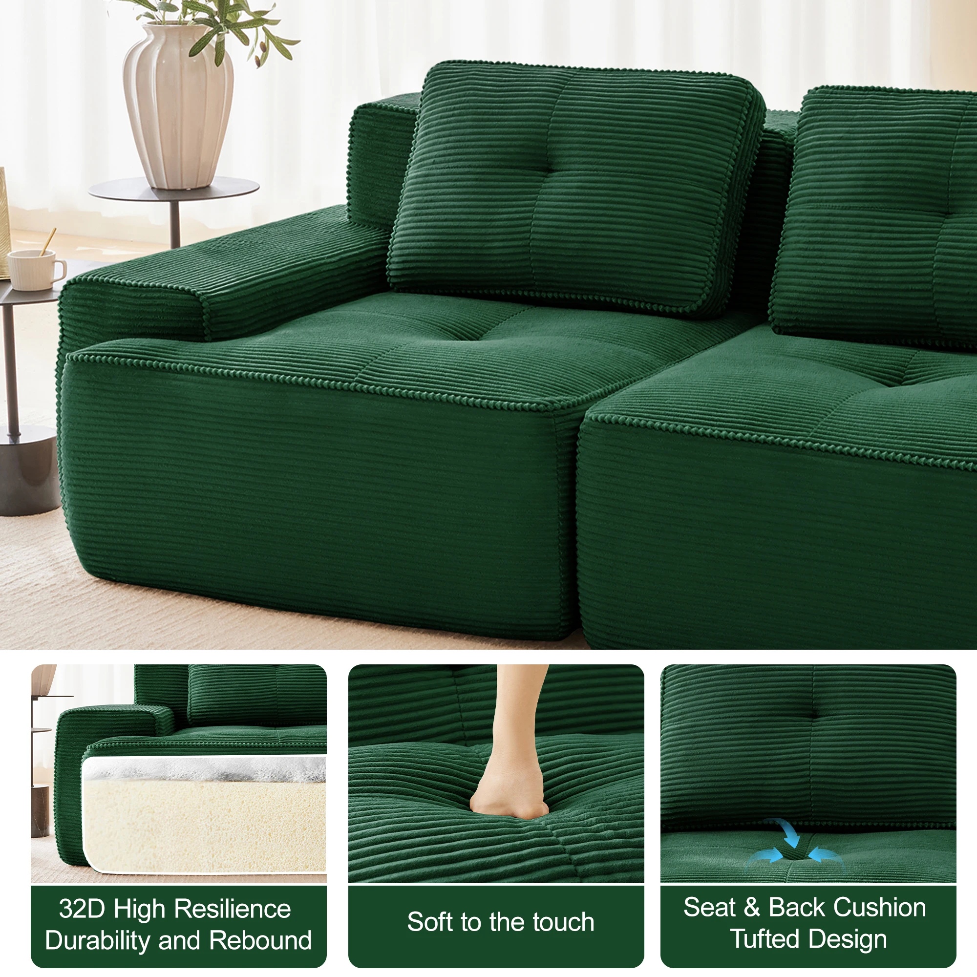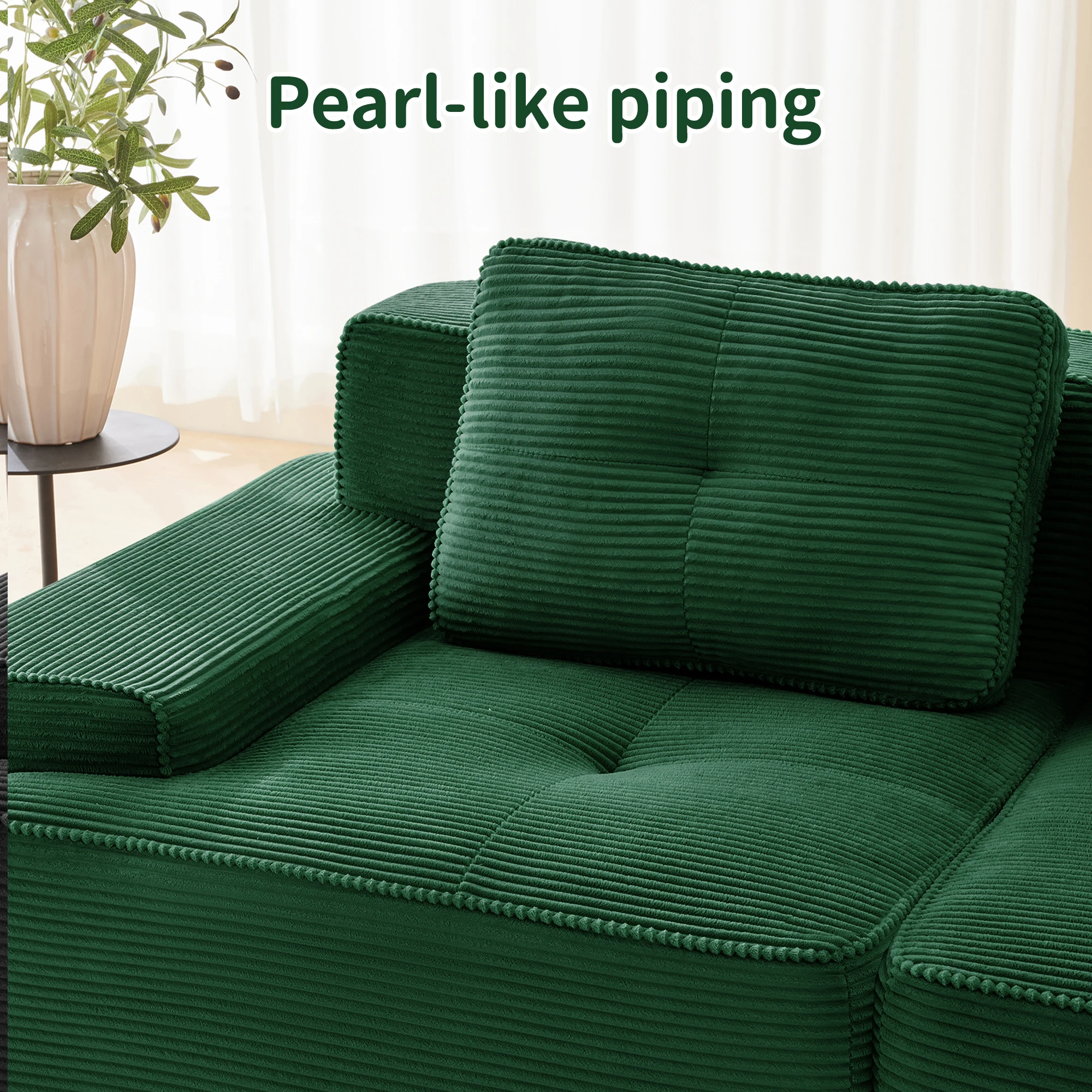 【Мягкая и приятная для домашних животных вельветовая ткань】Наслаждайтесь нашим вельветовым диваном, обернутым бархатистой мягкой дышащей тканью, которая одновременно роскошна и долговечна.Этот модульный диван легко выдерживает царапины домашних животных и изготовлен из устойчивого к царапинам материала, который легко чистится, обеспечивает полное спокойствие.Это стильный, но практичный диван для гостиной, украшенный жемчужной окантовкой.