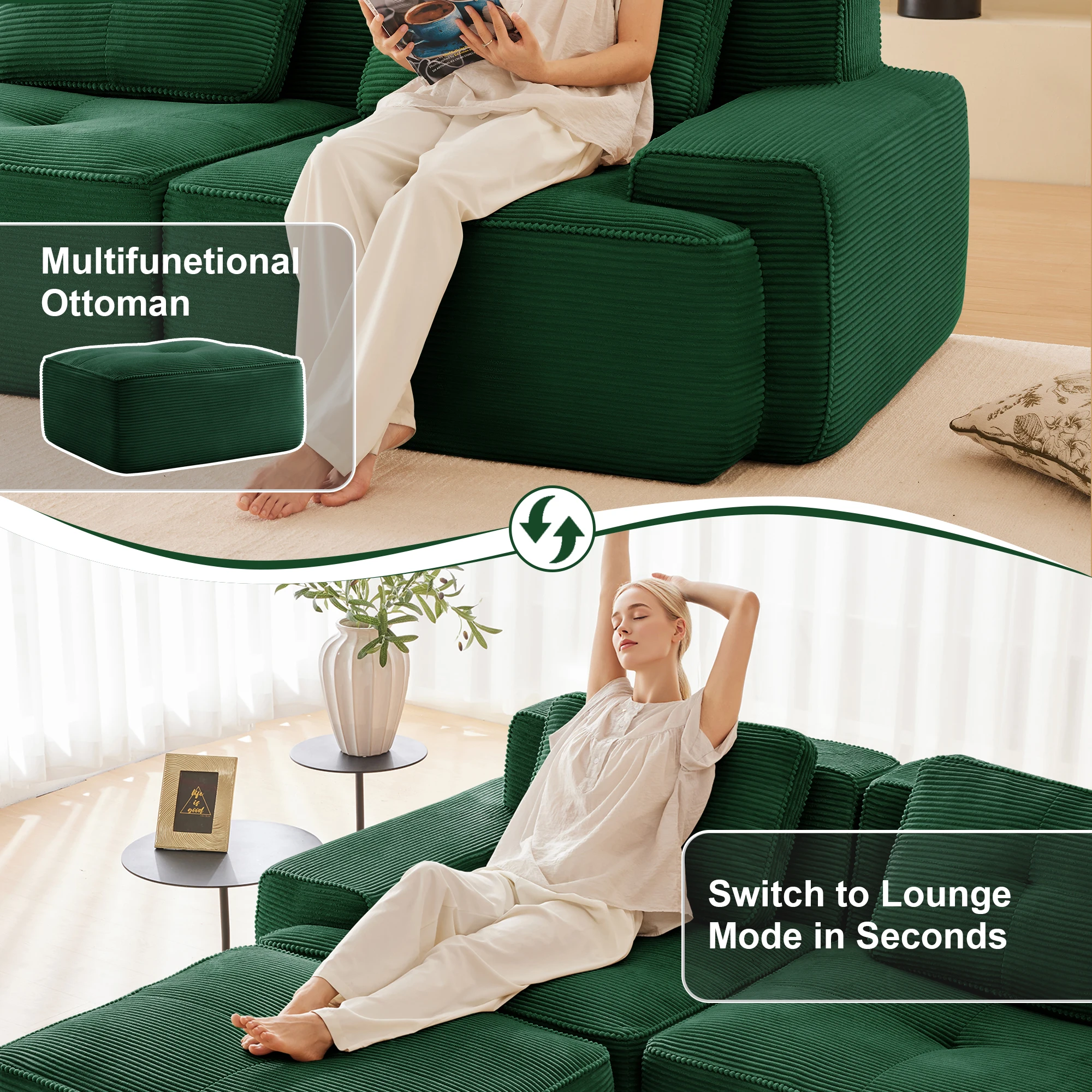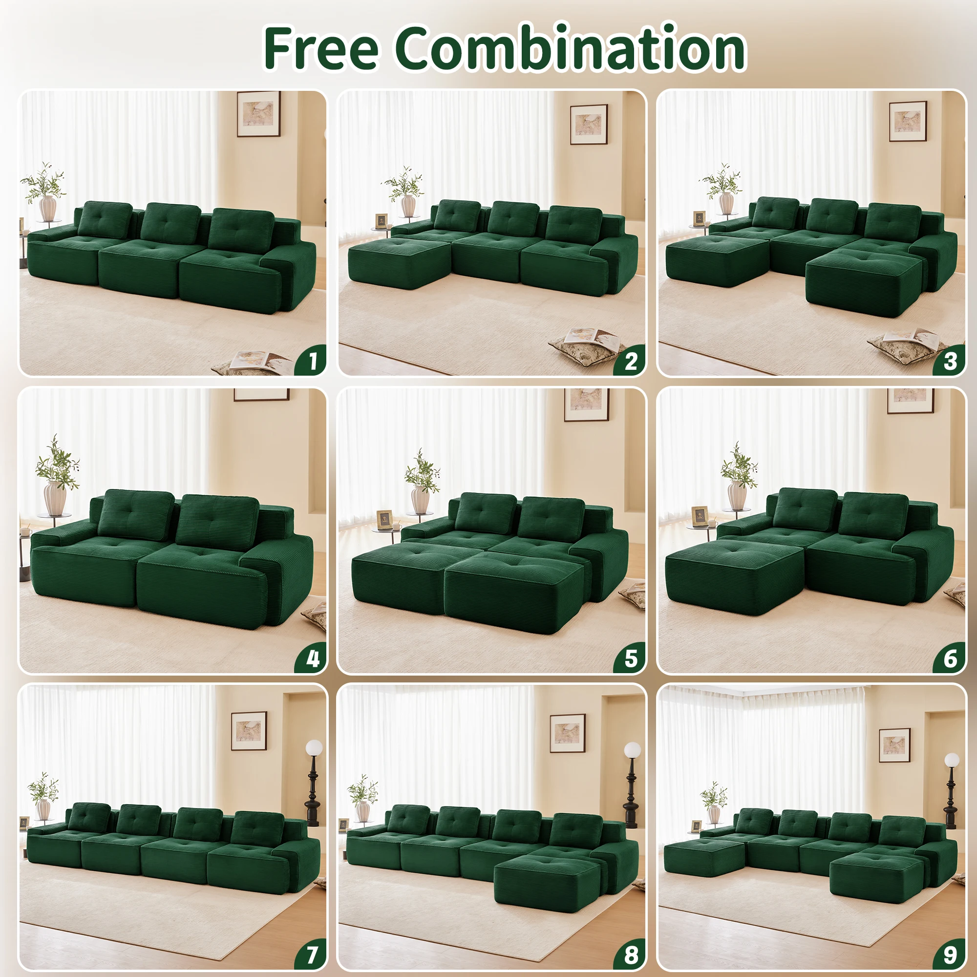 【Модульный дизайн и бесконечные возможности】Этот модульный облачный диван позволяет гибко расположить его в соответствии с вашими потребностями.Модули можно использовать как пуфик, двухместный диван, небольшой диван, 2-местный, 3-местный, 4-местный большой диван, спальный диван, L-образный диван или U-образный диван.Создайте идеальную планировку для отдыха, развлечения гостей или растяжки — полностью в соответствии с вашим пространством и правилами.