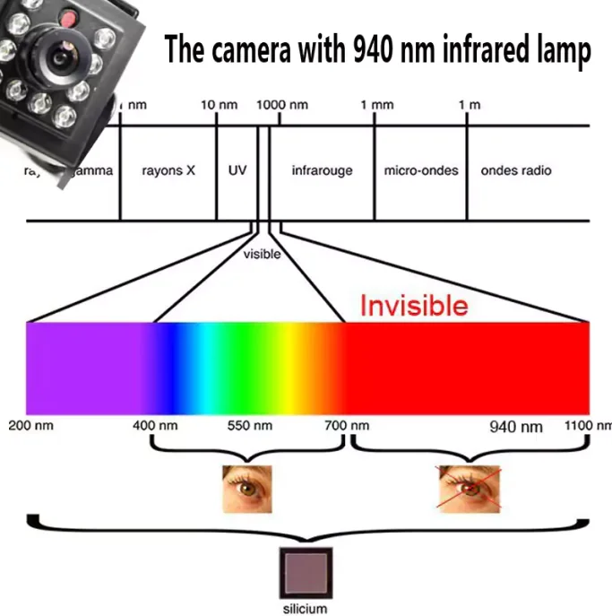 10 инфракрасных светодиодов, расстояние ночного видения 10-15 м, по умолчанию ИК-светодиоды 940 нм, 850 нм опционально