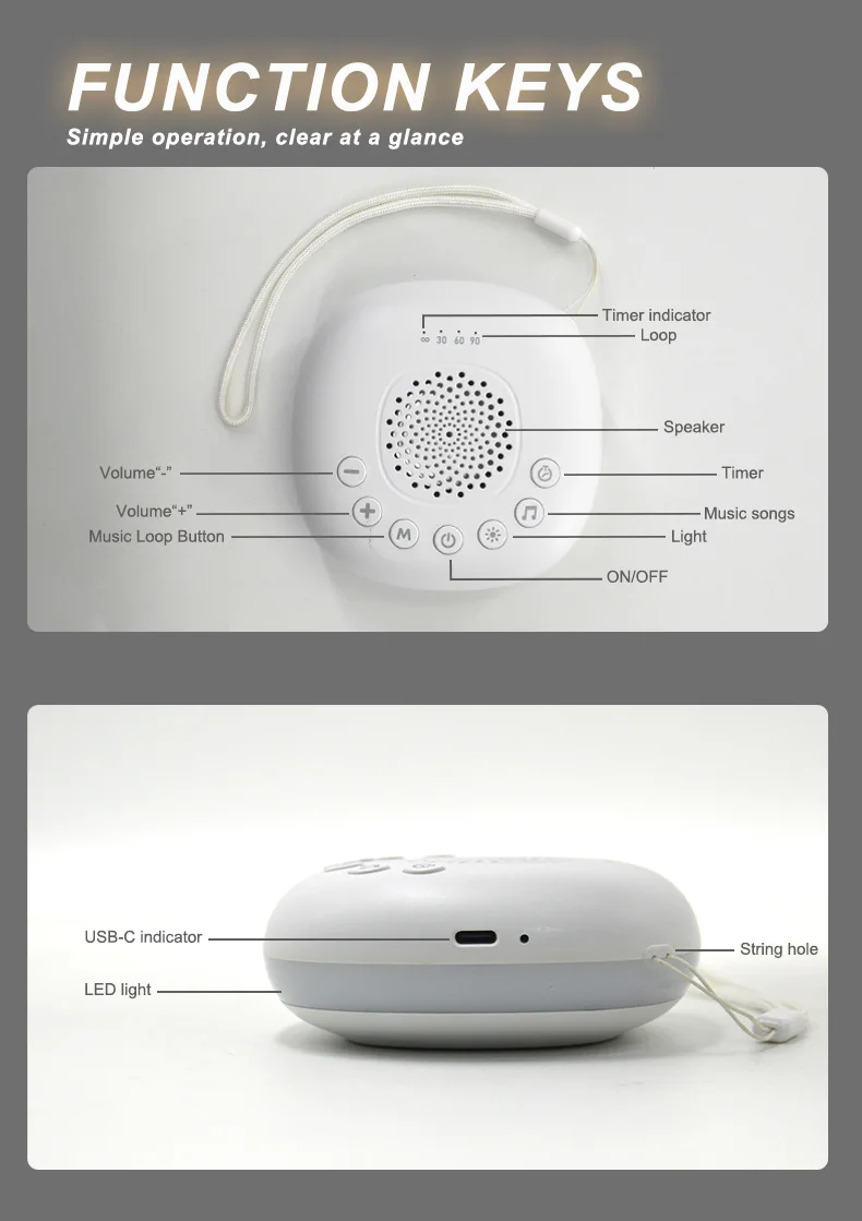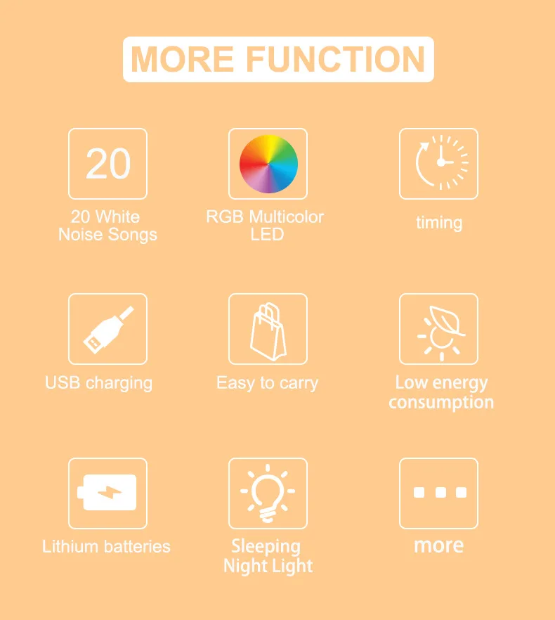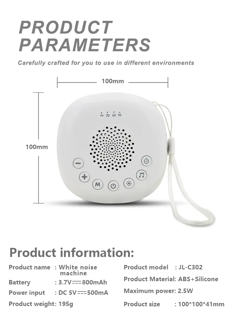 Вы можете установить параметры таймера в диапазоне 15/30/60 минут, чтобы сэкономить энергию; Регулируемая громкость позволяет создать для вашего ребенка лучшую среду для сна.