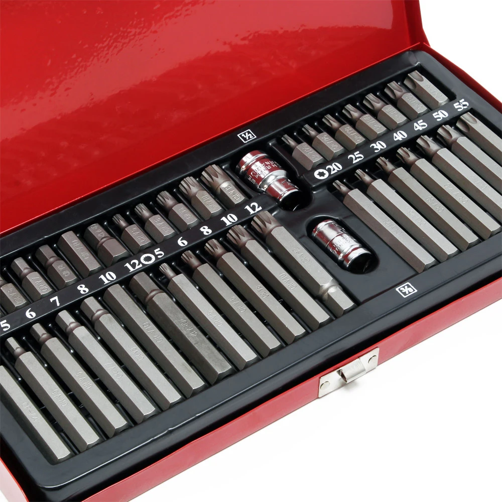 2.Полный комплект: набор из 40 шт., 14 шт. (T20 + T25 + T30 + T40 + T50 + T55) + 14 шт. (H4 + H5 + H6 + H7 + H8 + H10 + H12) + 10 шт. (M5 + M6 + M8 + M10 + M12) + 2 шт. адаптера (3/8 дюйма и 1/2 дюйма).