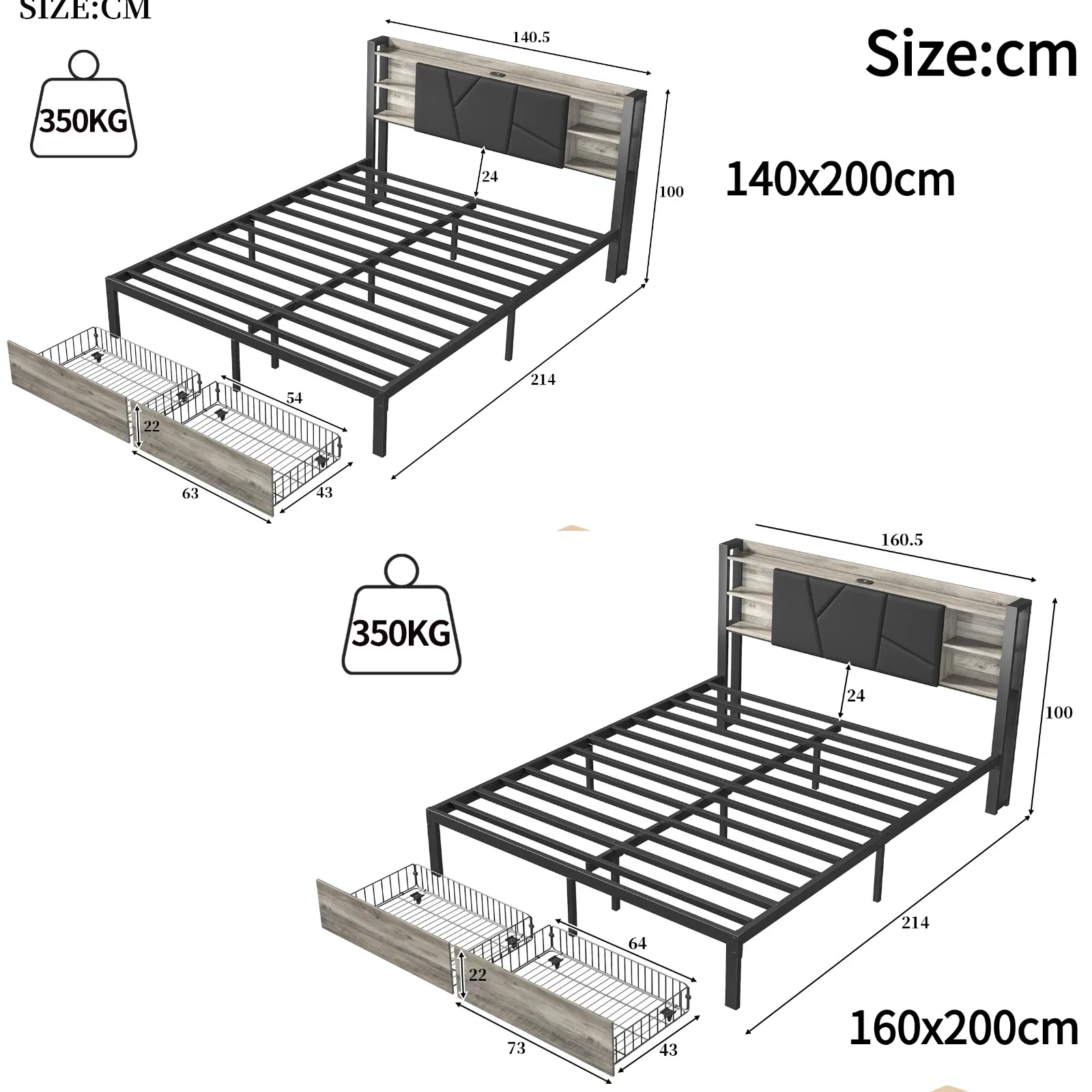 Мягкая кровать Comanlai 140×200 см/160×200 см со светодиодной подсветкой и 2 ящиками, двуспальная кровать с USB-портом для зарядки и металлическим каркасом кровати